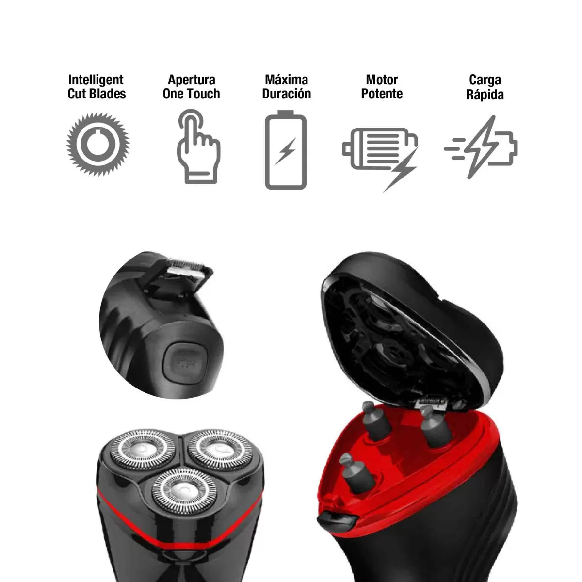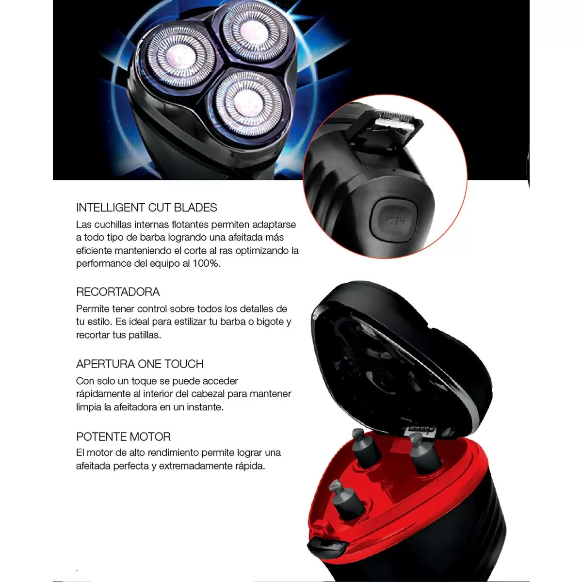 Ideal para quienes buscan practicidad, incluye recortadora desplegable para definir patillas y barba, y un sistema de apertura “One Touch” que permite limpiar fácilmente el cabezal.