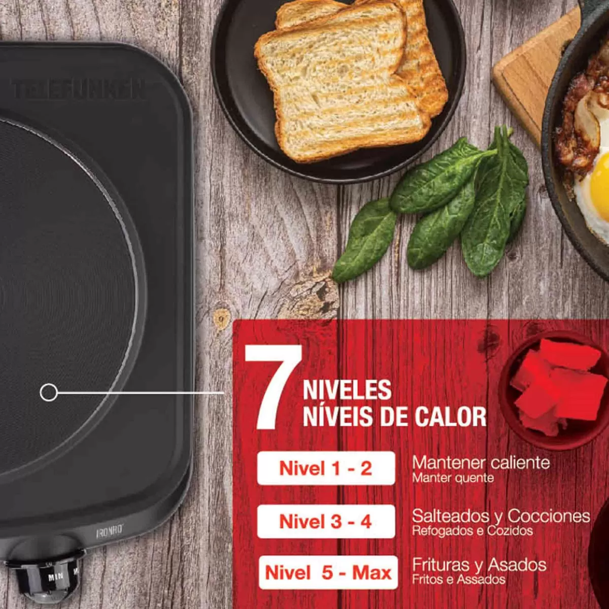 Anafe Eléctrico Telefunken TF-AE5500 ideal para casas u oficinas. Óptimo rendimiento. Fácil de usar. La superficie de hierro de construcción resistente asegura una transferencia máxima de calor. Su medida estándar de 18 cm permite utilizar todo tipo de cacerolas.