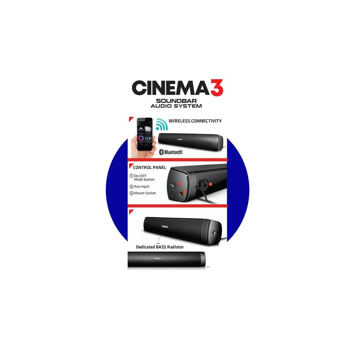 El Cinema 3 de Novik es un sistema de home estudio soundbar para TV. Este complejo sistema te ofrece un sonido de calidad, con bajos profundos y una sensación similar al de un cine por su sonido envolvente 360°, no solo puedes conectar a una TV, sino que también puedes conectar dispositivos móviles o Tablet gracias a su modo bluetooth o entrada auxiliar de 3,5mm. Además, posee dos orificios en su parte trasera para colgar en una pared.