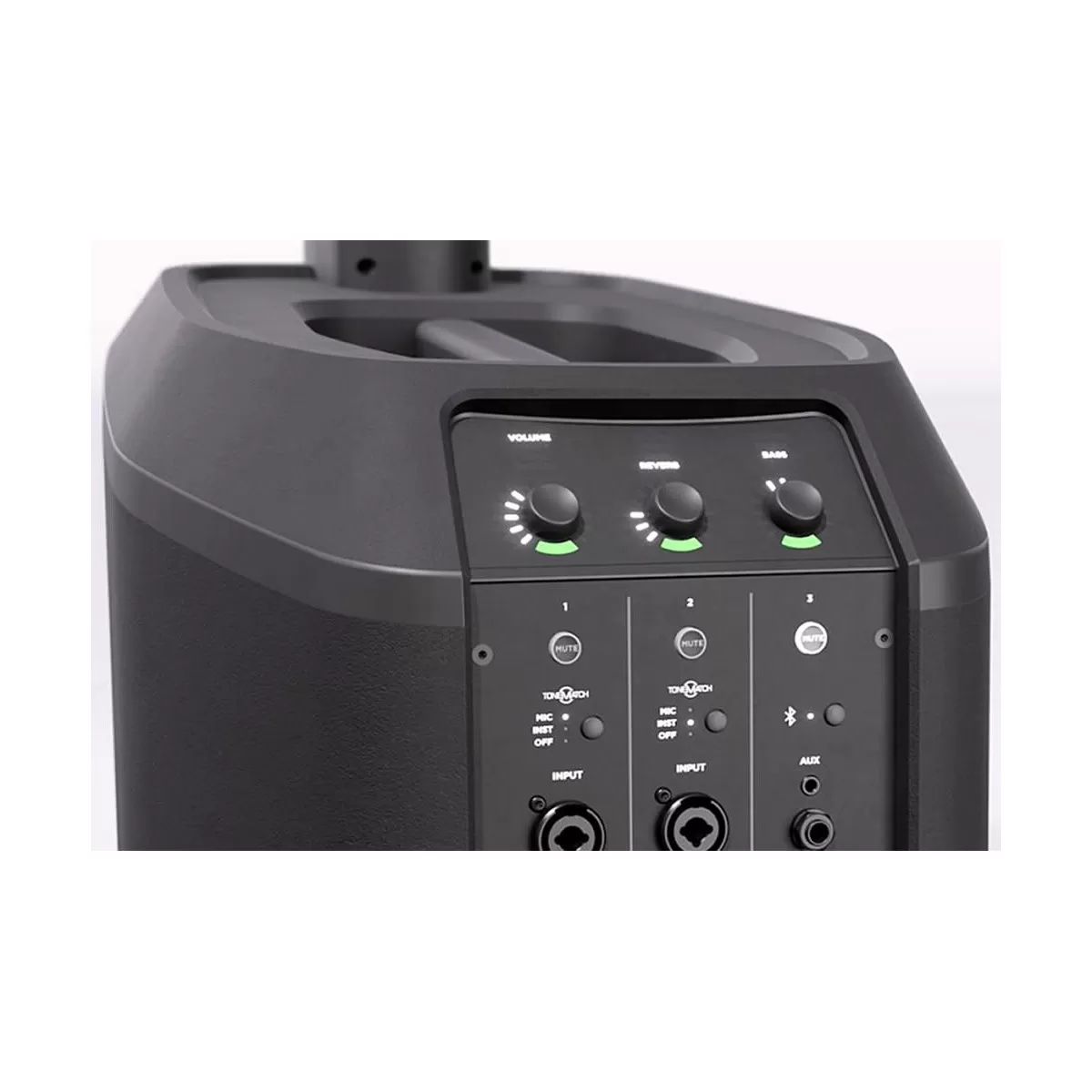 Conecte diversas fuentes de audio fácilmente a través del mezclador incorporado con dos entradas combinadas XLR-de 6.35 mm (1/4") con alimentación phantom, una entrada auxiliar de 6.35 mm y 3.5 mm (1/4 y 1/8"), además de transmisión Bluetooth® y acceso al ecualizador del sistema y los preajustes ToneMatch, volumen, tono y reverberación a través de controles iluminados.