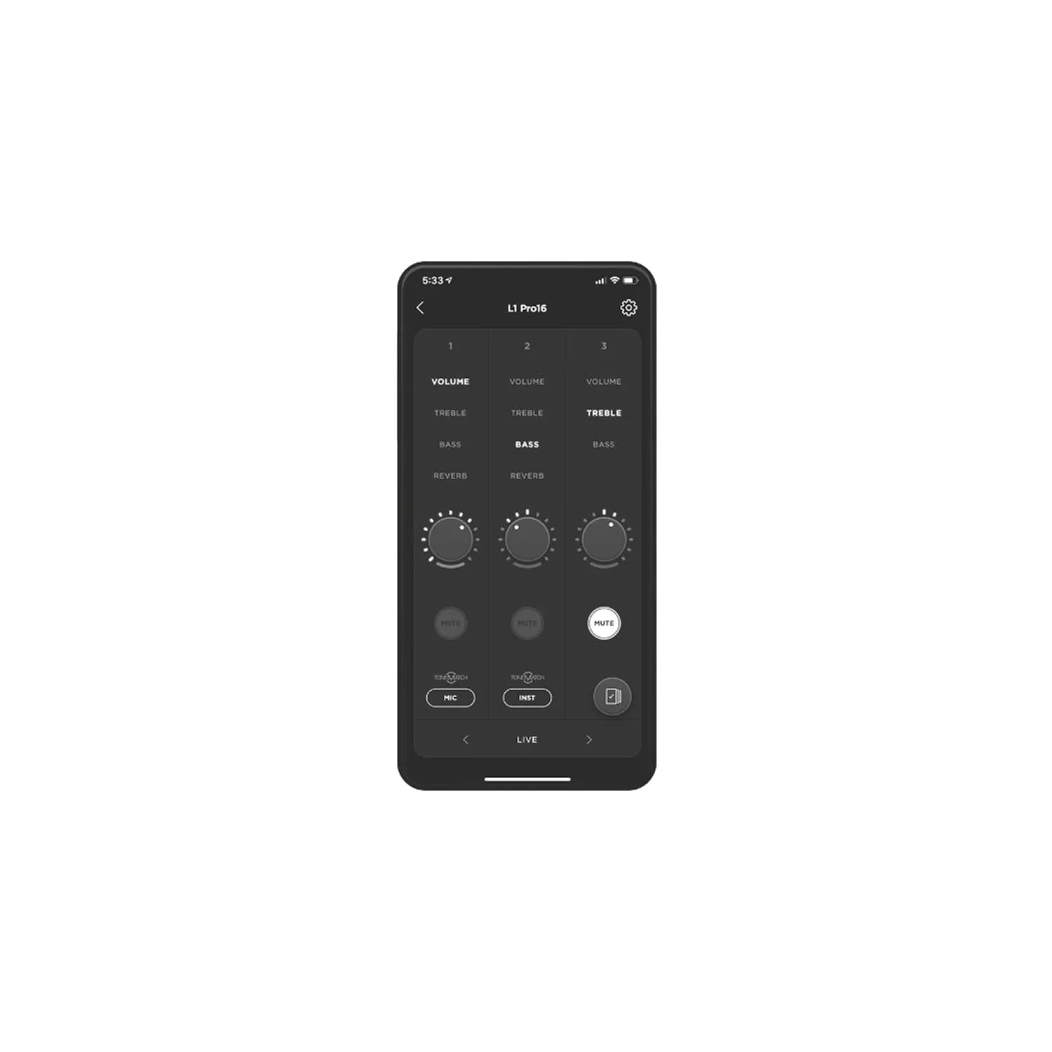 Tome el control inalámbrico con la aplicación L1 Mix en su smartphone para ajustar la configuración al instante, recorrer la sala y ajustar el sonido, y acceder a la biblioteca ToneMatch de preajustes personalizados del ecualizador.