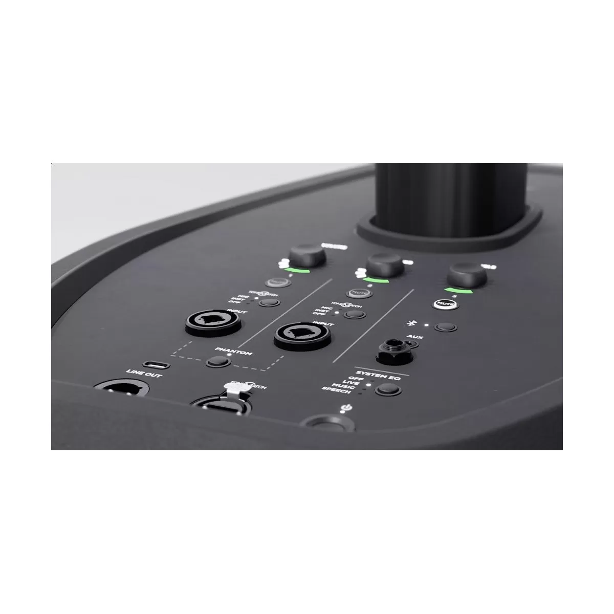 Conecte diversas fuentes de audio fácilmente a través del mezclador incorporado con 2 entradas combinadas XLR-1/4"con alimentación phantom, una entrada auxiliar de 1/4" y 1/8" (3.5 mm), además de transmisión Bluetooth® y acceso al ecualizador del sistema y los preajustes ToneMatch, el volumen, el tono y la reverberación a través de controles iluminados.