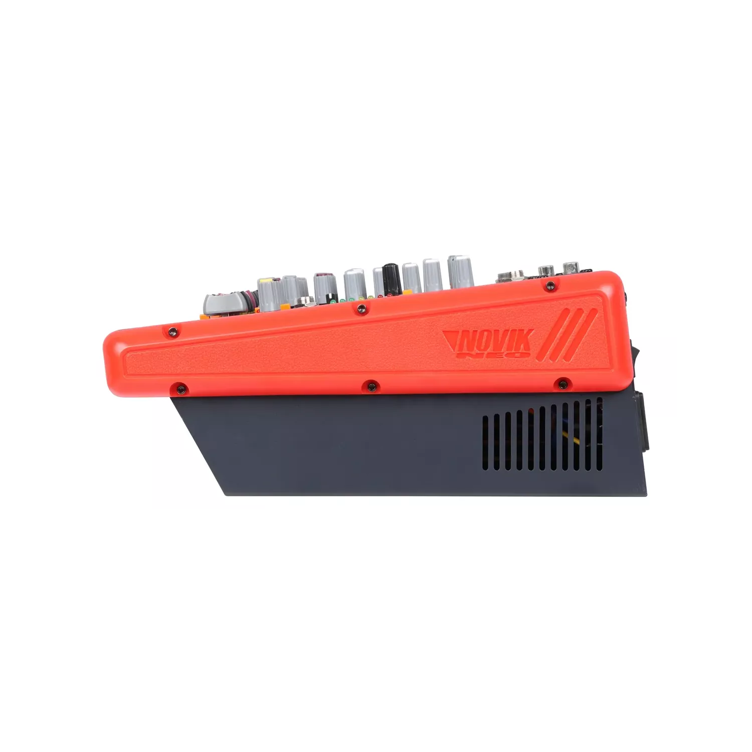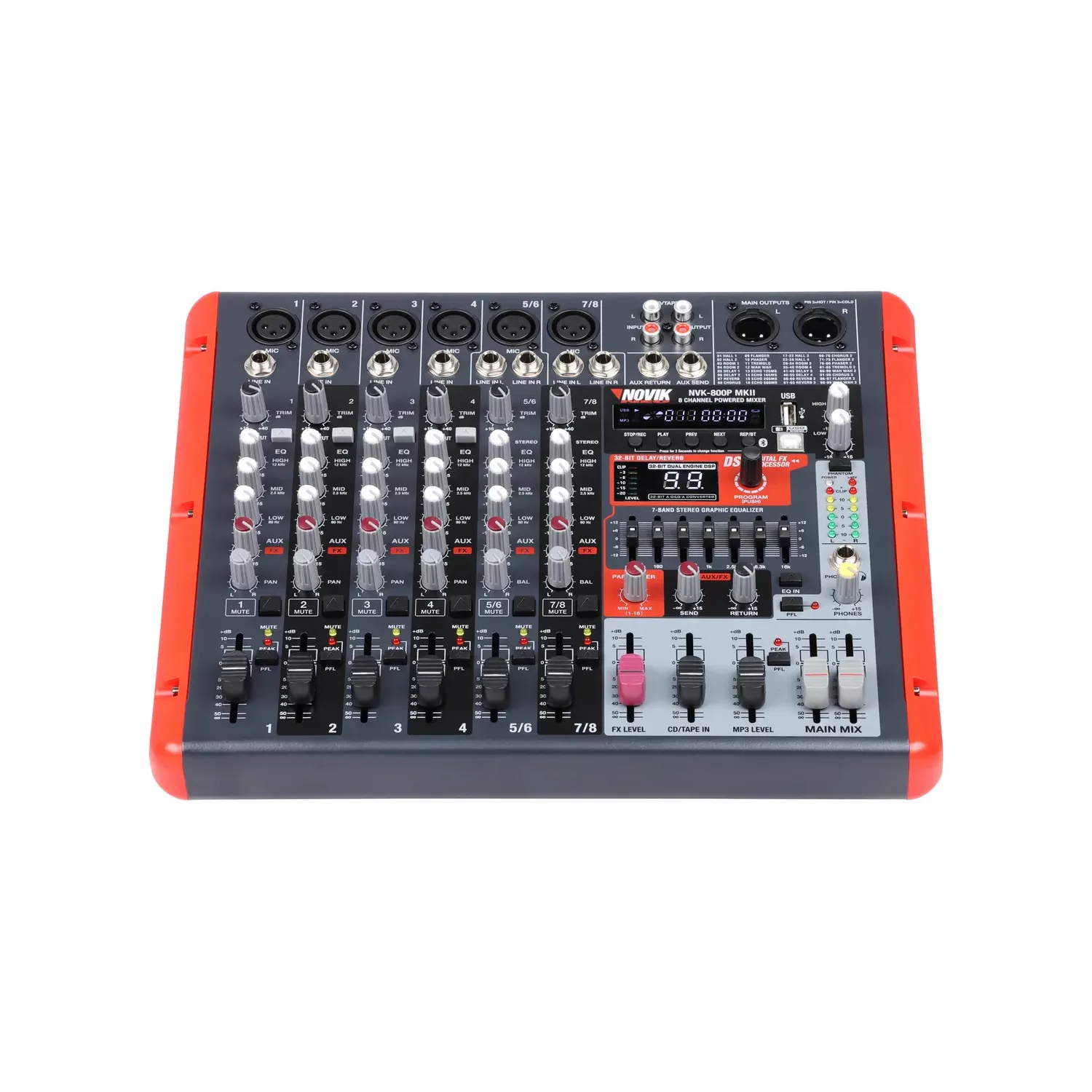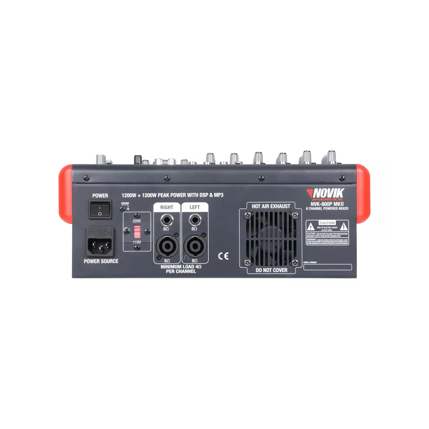 La NVK-800P MKII es una consola amplificada de alto rendimiento, ideal para eventos en vivo y presentaciones. Con una potencia de 600W por canal y un máximo de 1200W, ofrece un sonido potente y claro. Incorpora un reproductor de MP3 con ecualización individual, grabación directa a USB y conectividad Bluetooth, lo que facilita la reproducción de música desde diferentes fuentes. Su DSP con efectos internos como Delay y Reverb, y su ecualizador gráfico de 7 bandas para el Master, permiten una mezcla precisa y de alta calidad. Con 6 canales con Phantom Power (+48V), preamplificadores de micrófono y cómodos faders, la NVK-800P MKII es la opción ideal para quienes buscan potencia y control en sus mezclas.