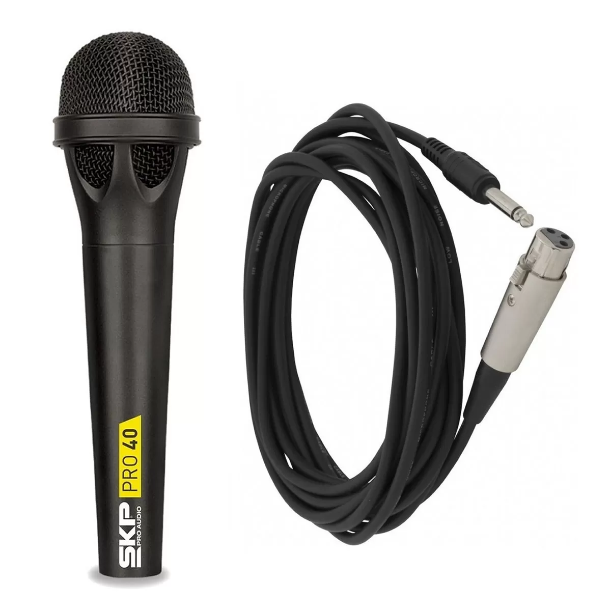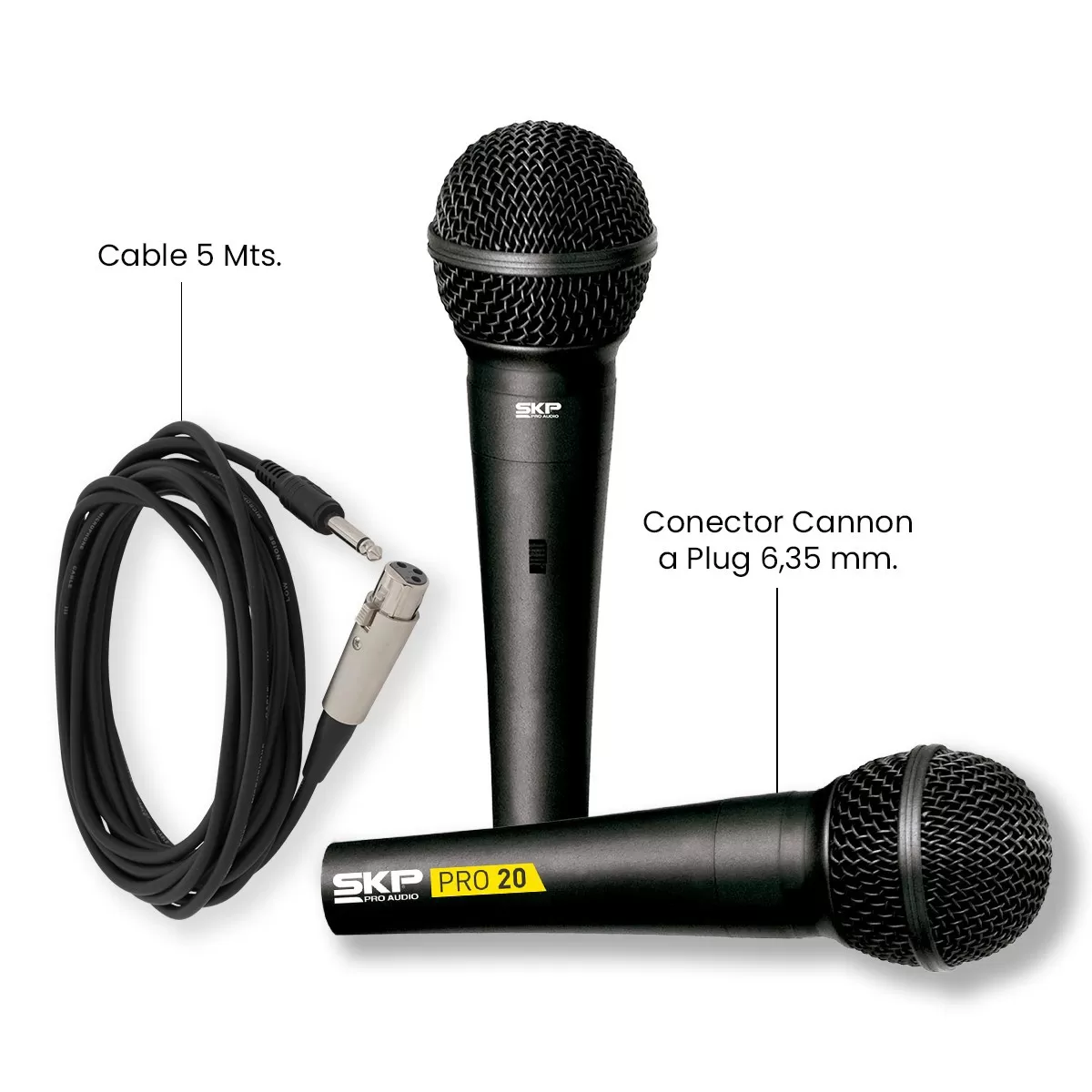 Micrófono de Mano o Vocal SKP PRO-20 Dinámico con Patrón Polar Cardiode. Recomendado para uso en Vivo, Presentadores. Cuerpo Metálico. Cable 5mts. Conectores XLR (Canon) a Plug 6,35mm (Jack 1/4")