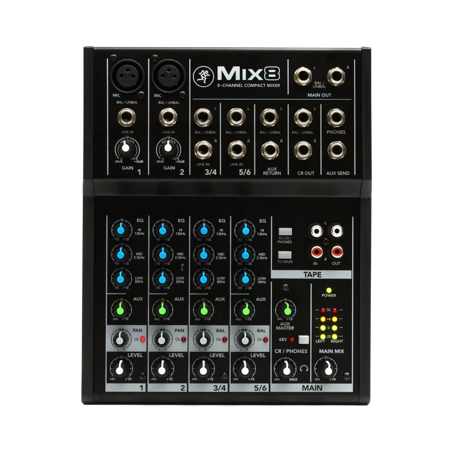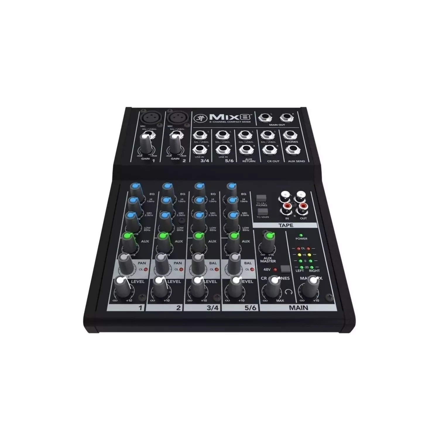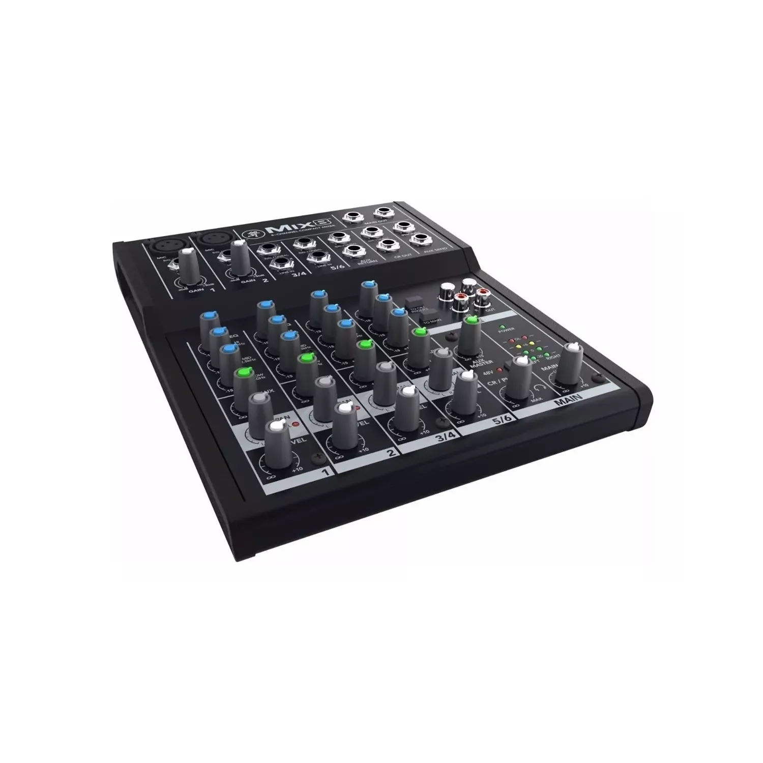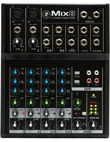 - Conectores: 2 mic XLR in, 2 line TRS-TS 6.3 mm in, 2 line TRS-TS L-mono/R 6.3 mm in, 1 main TRS-TS L/R 6.3 mm out, 1 monitor TRS L/R 6.3 mm out, 1 phone TRS 6.3 mm, 1 aux send TRS 6.3 mm out, 1 aux return jack L/R 6.3 mm out, 1 tape RCA L/R in, 1 tape RCA L/R out