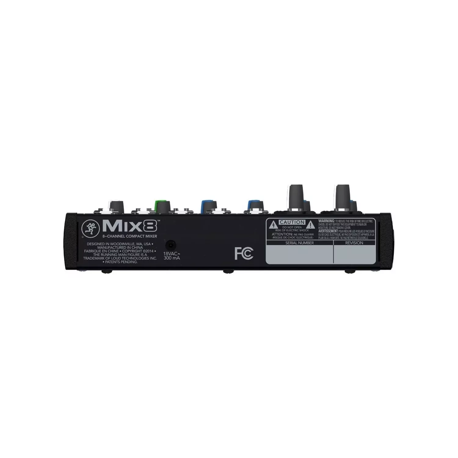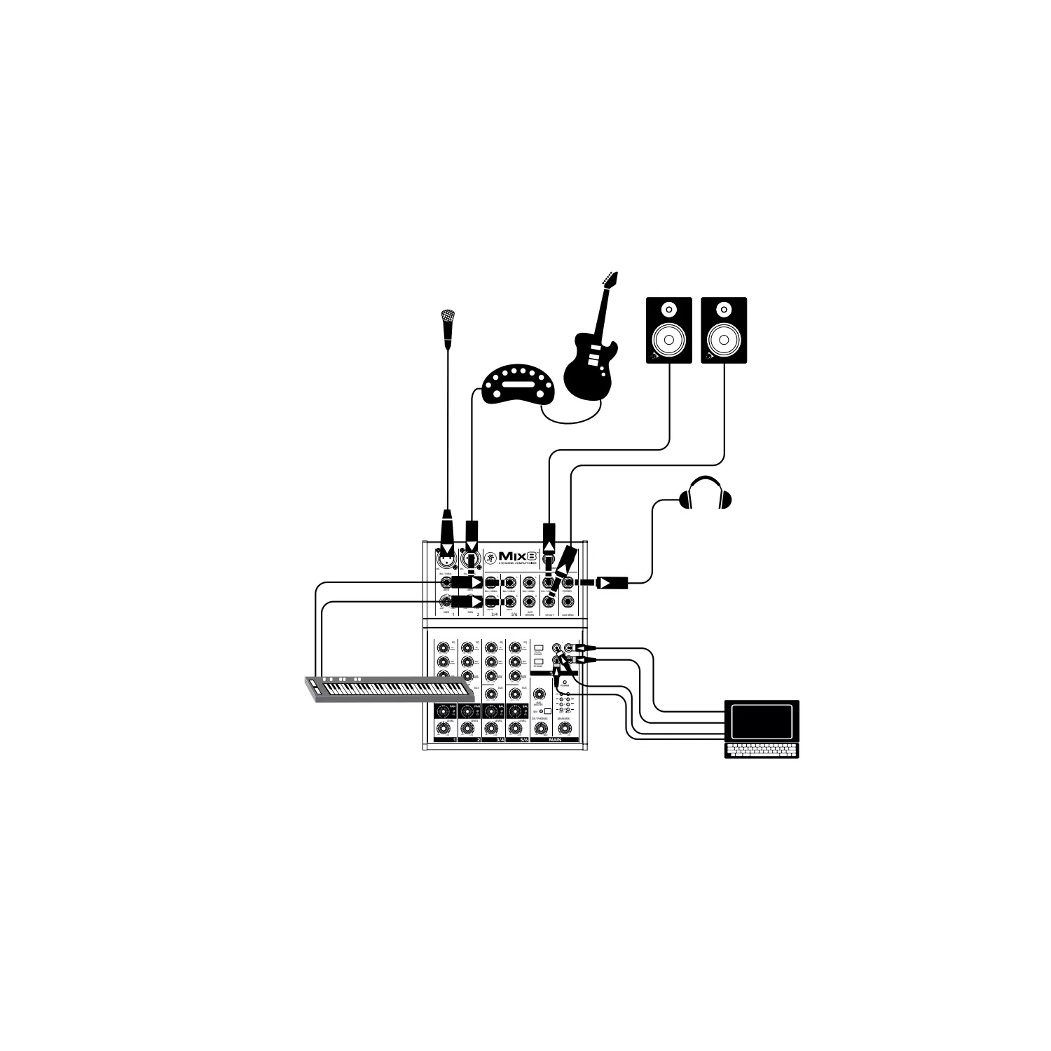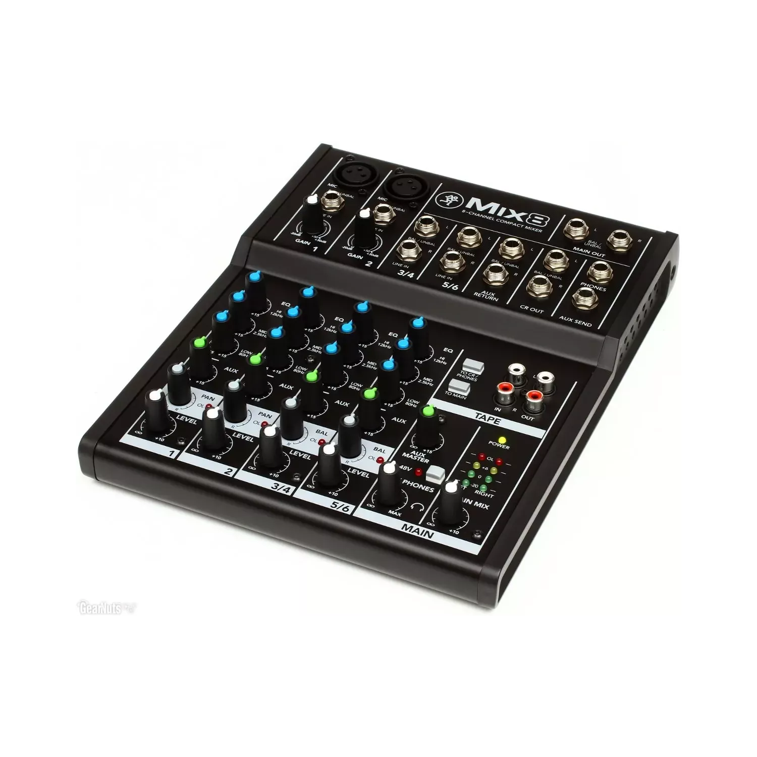 - Conectores: 2 mic XLR in, 2 line TRS-TS 6.3 mm in, 2 line TRS-TS L-mono/R 6.3 mm in, 1 main TRS-TS L/R 6.3 mm out, 1 monitor TRS L/R 6.3 mm out, 1 phone TRS 6.3 mm, 1 aux send TRS 6.3 mm out, 1 aux return jack L/R 6.3 mm out, 1 tape RCA L/R in, 1 tape RCA L/R out