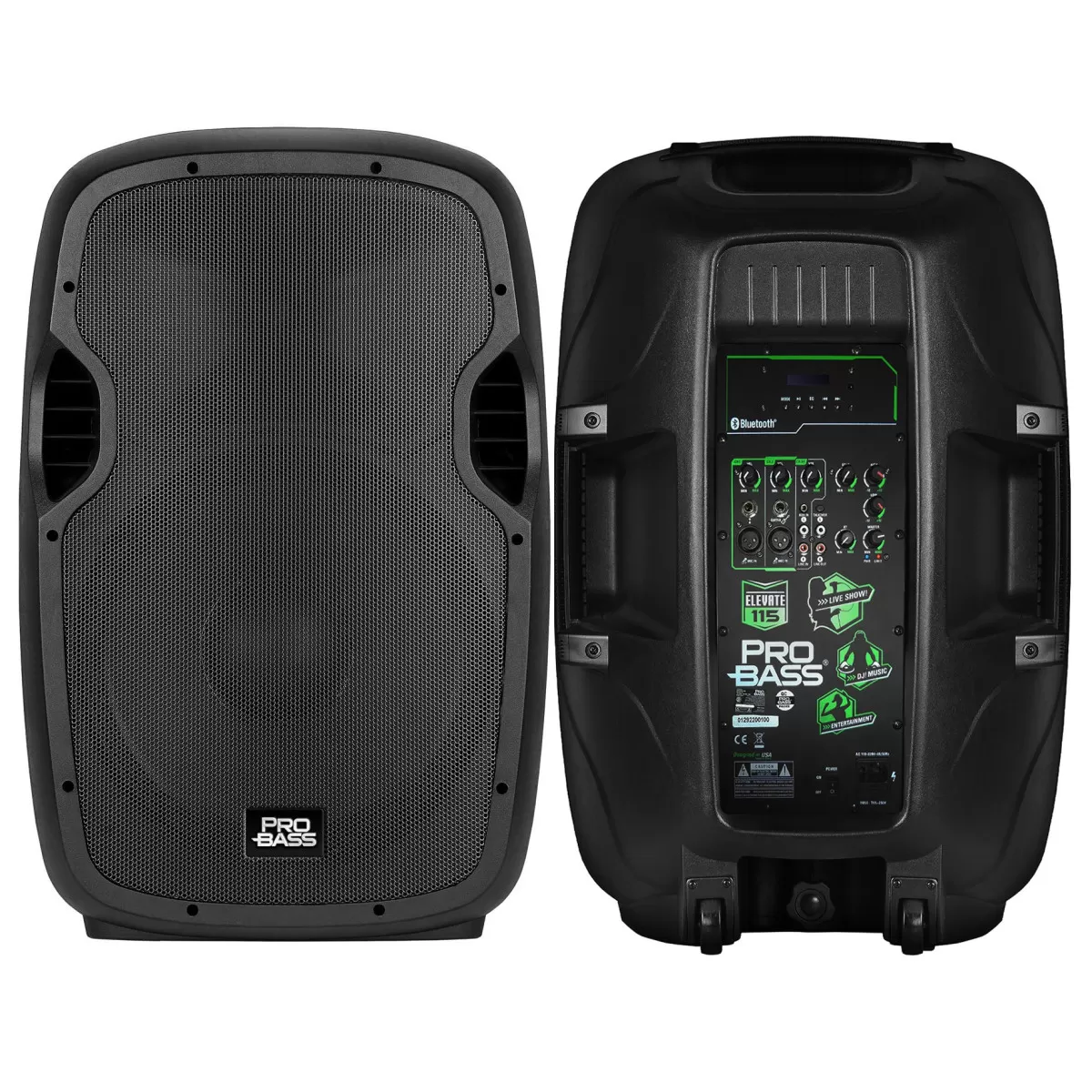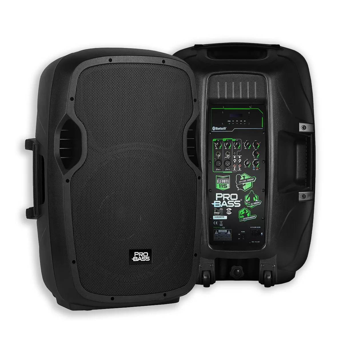Bafle Potenciado PROBASS ELEVATE 115, con Woofer de 15", 250W RMS y 2000W de Potencia Máxima. Conectividad Bluetooth - 2 Vías. Conexión para Micrófono y Guitarra con Control Remoto