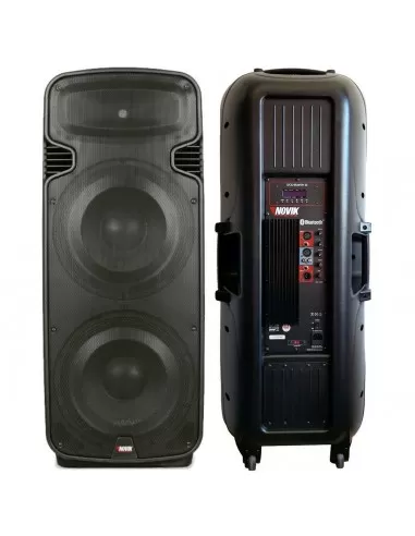Bafle activo Full Range de 2 Vías, NOVIK EVOD BRAVERY 215, con Doble Woofer de 15" y 1800W de potencia máxima. Cuenta con manija extensible y ruedas para transporte. Conexión Bluetooth® y entradas para micrófono y línea. Alto rendimiento en clubes, bandas callejeras, iglesias, escenarios y compañías de sonido. Se destaca entre otras torres de sonido por su GRAN POTENCIA.