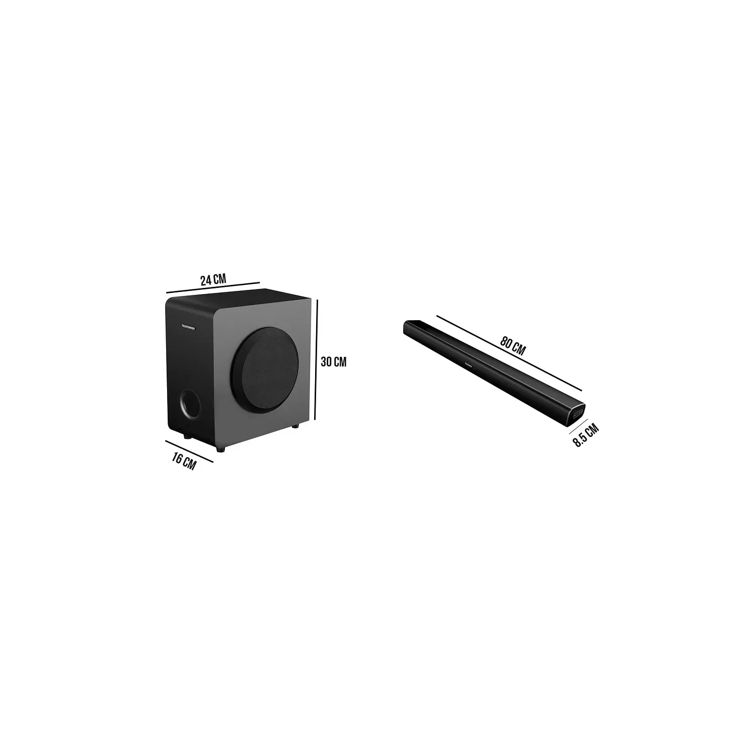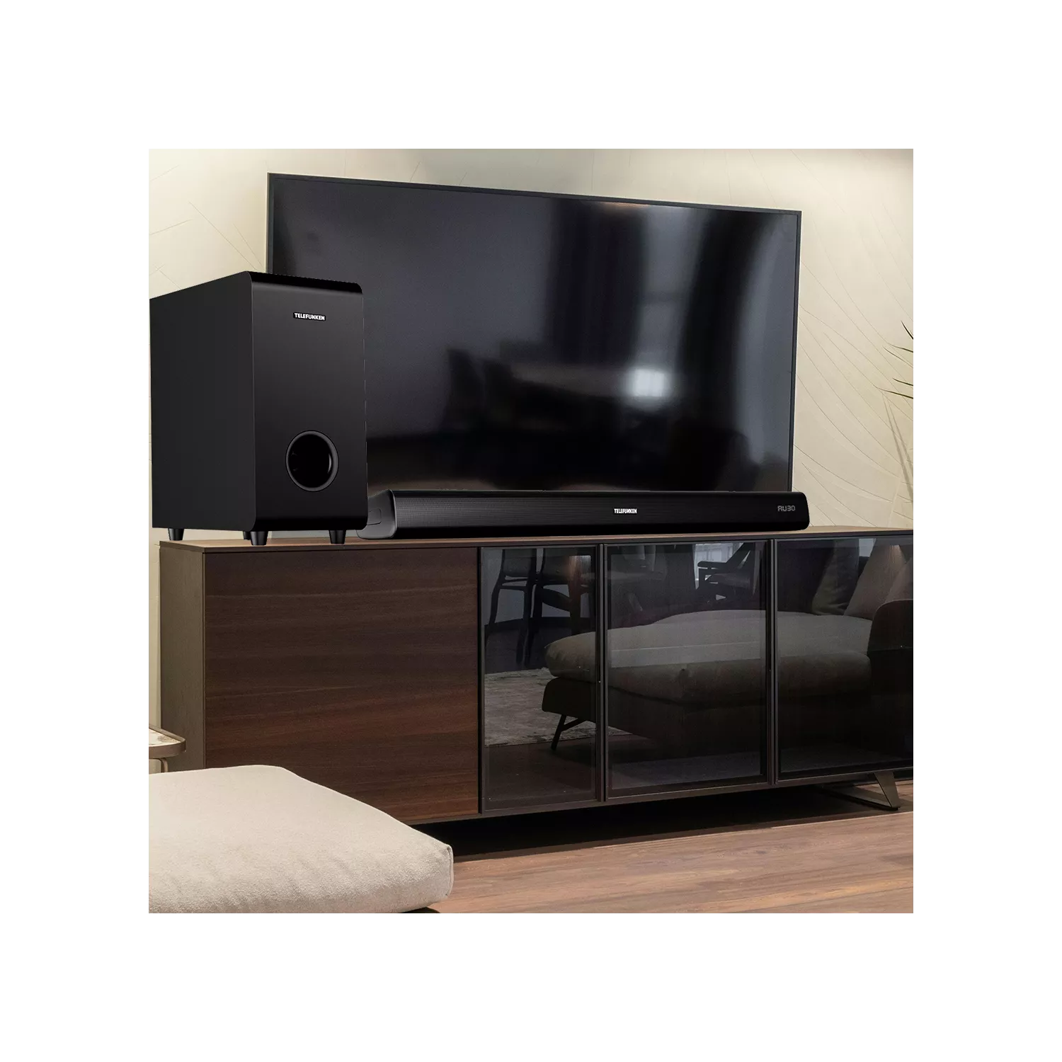 Este potente combo de soundbar + subwoofer ofrece un sonido envolvente con bajos profundos, ideal para películas, series, música y gaming. Con Bluetooth®, entrada auxiliar y control remoto incluido, se adapta fácilmente a tu TV o dispositivos móviles.