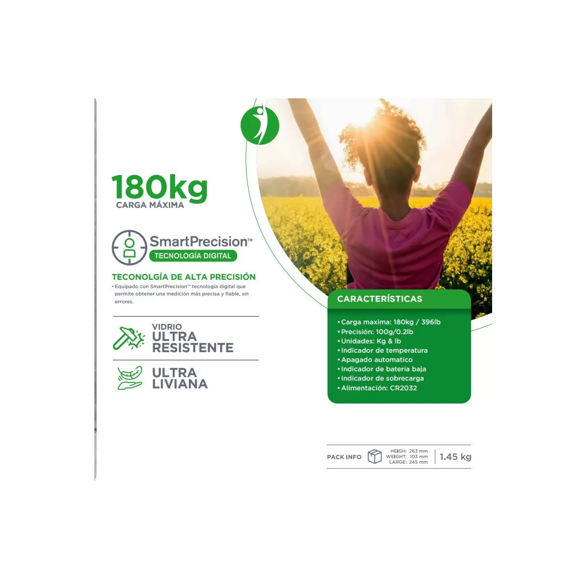 Soporta hasta 180 kg, ofrece una lectura rápida y clara con su pantalla digital, e incluye indicadores inteligentes de temperatura, batería baja y sobrecarga. Su estructura de vidrio ultra resistente y diseño ultra liviano hacen que sea práctica y duradera para cualquier hogar.