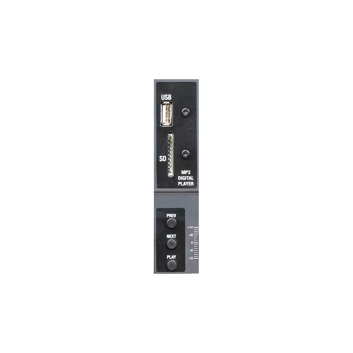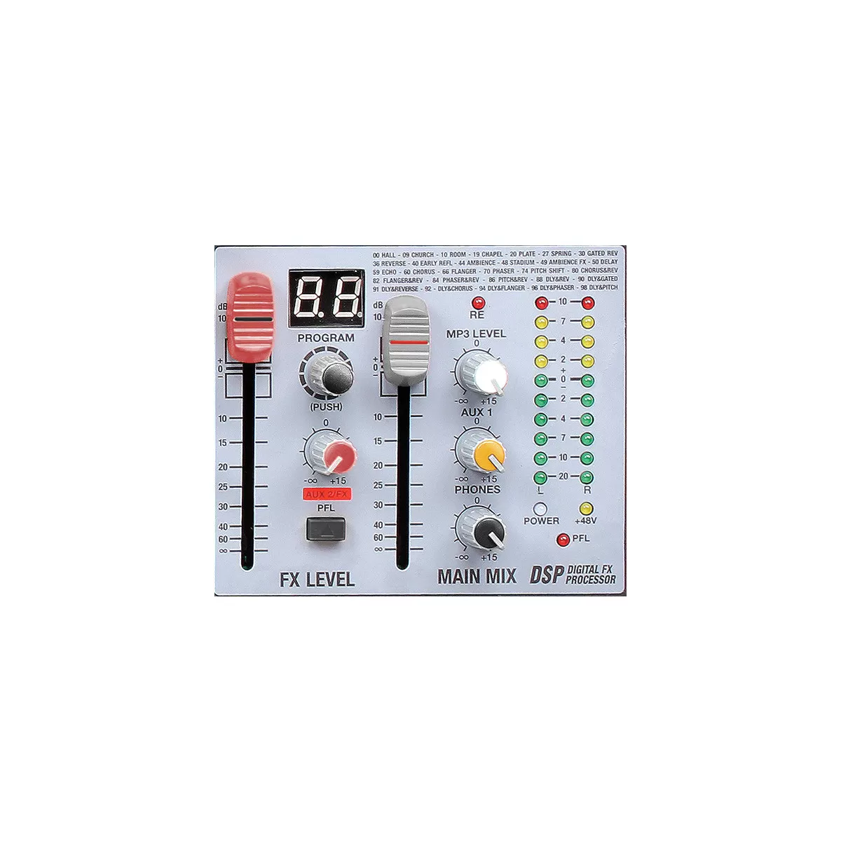 Incorpora un procesador DSP de 24 bits con 99 efectos internos, ecualización de 3 bandas por canal y ecualizador gráfico de 7 bandas en el master, permitiendo un ajuste preciso del sonido. Incluye reproductor MP3 integrado compatible con memorias USB y SD.
