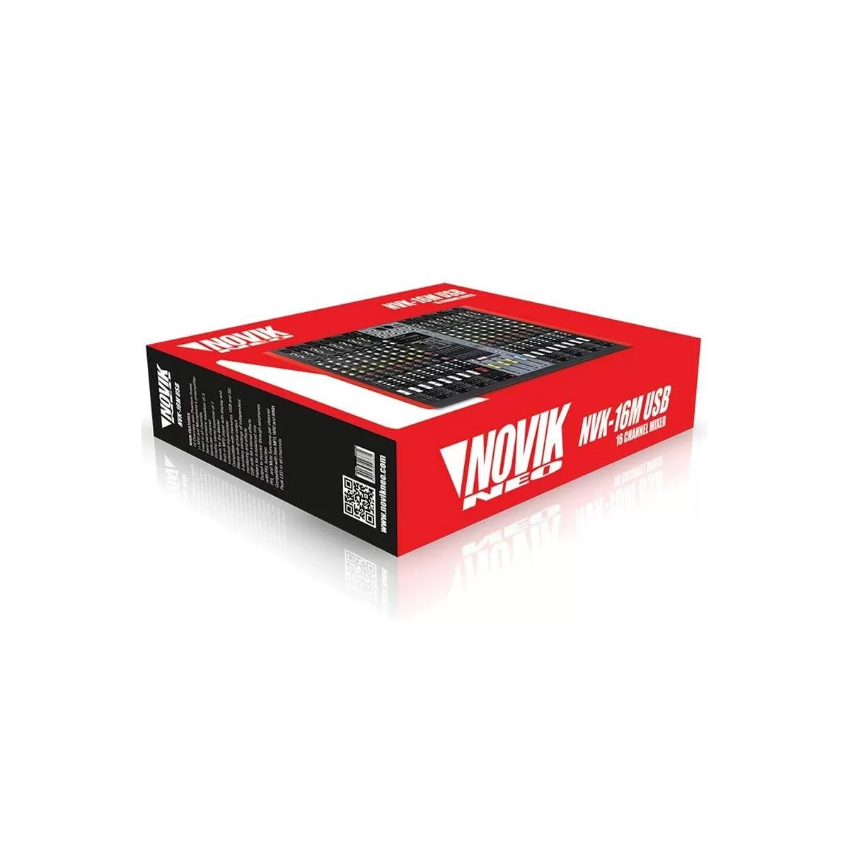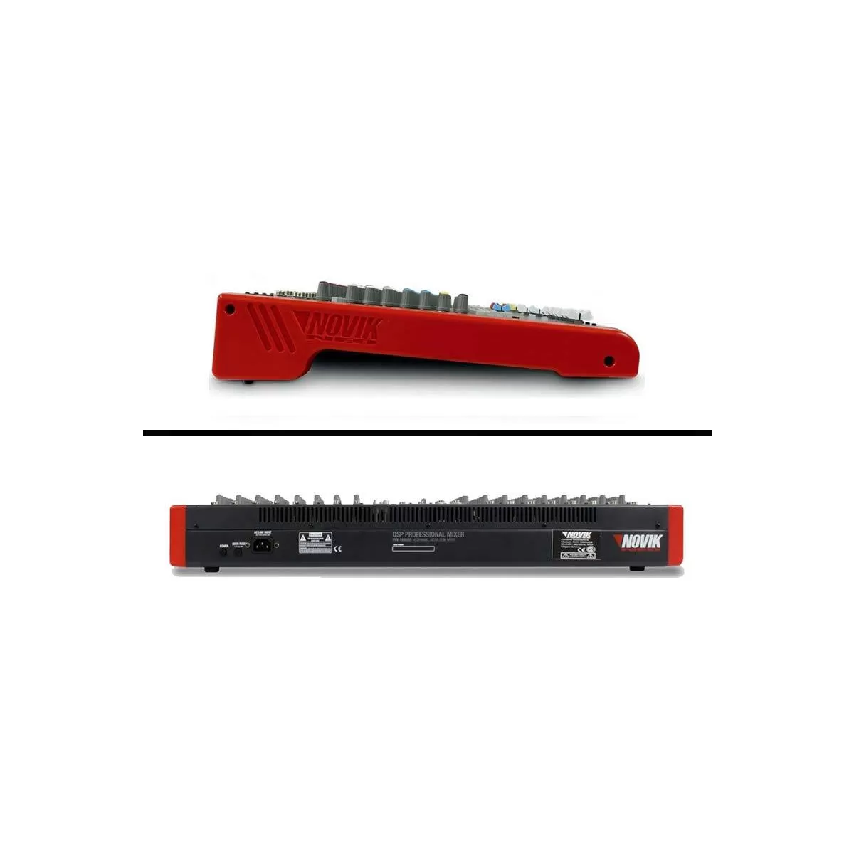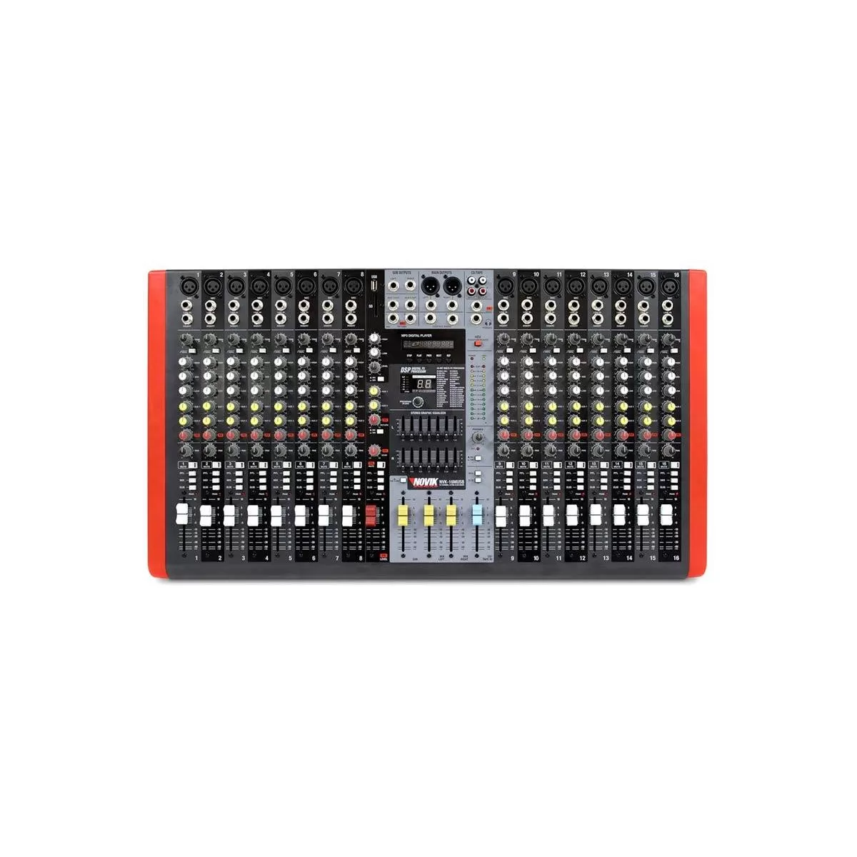 Consola de Sonido Mixer Novik NVK-16M 16 Canales con Reproductor de MP3 incorporado y DSP con 99 Efectos internos. Presenta una construcción robusta y múltiples entradas de micrófono y de línea, ecualizador de 3 bandas, envíos AUX/FX e insertos en todos los canales, es la mejor opción para usar en sistemas fijos y móviles de sonido en vivo o grabación.