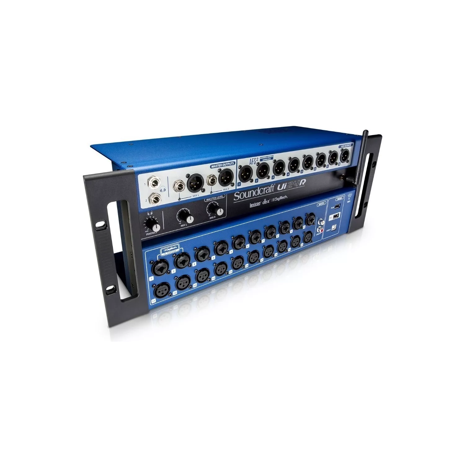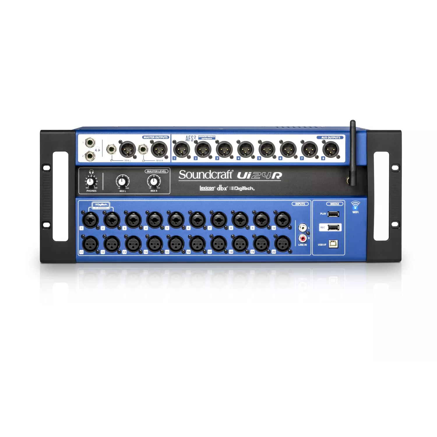 Ui24R es una consola digital de 24 canales, rack 4U. Integra Wi-Fi de doble banda y control remoto desde tablet, smartphone o PC — podés manejar mezcla y grabación desde cualquier lugar del recinto. Viene con 20 preamplificadores de micrófono diseñados por Studer, DSP completo con compresión, ecualización, gates, efectos Lexicon y DigiTech, supresión automática de feedback dbx AFS2, grabación multipista redundante por USB y salida stereo/auxiliares balanceadas. Perfecto para quienes necesitan versatilidad, calidad y resultados profesionales en un equipo compacto.
