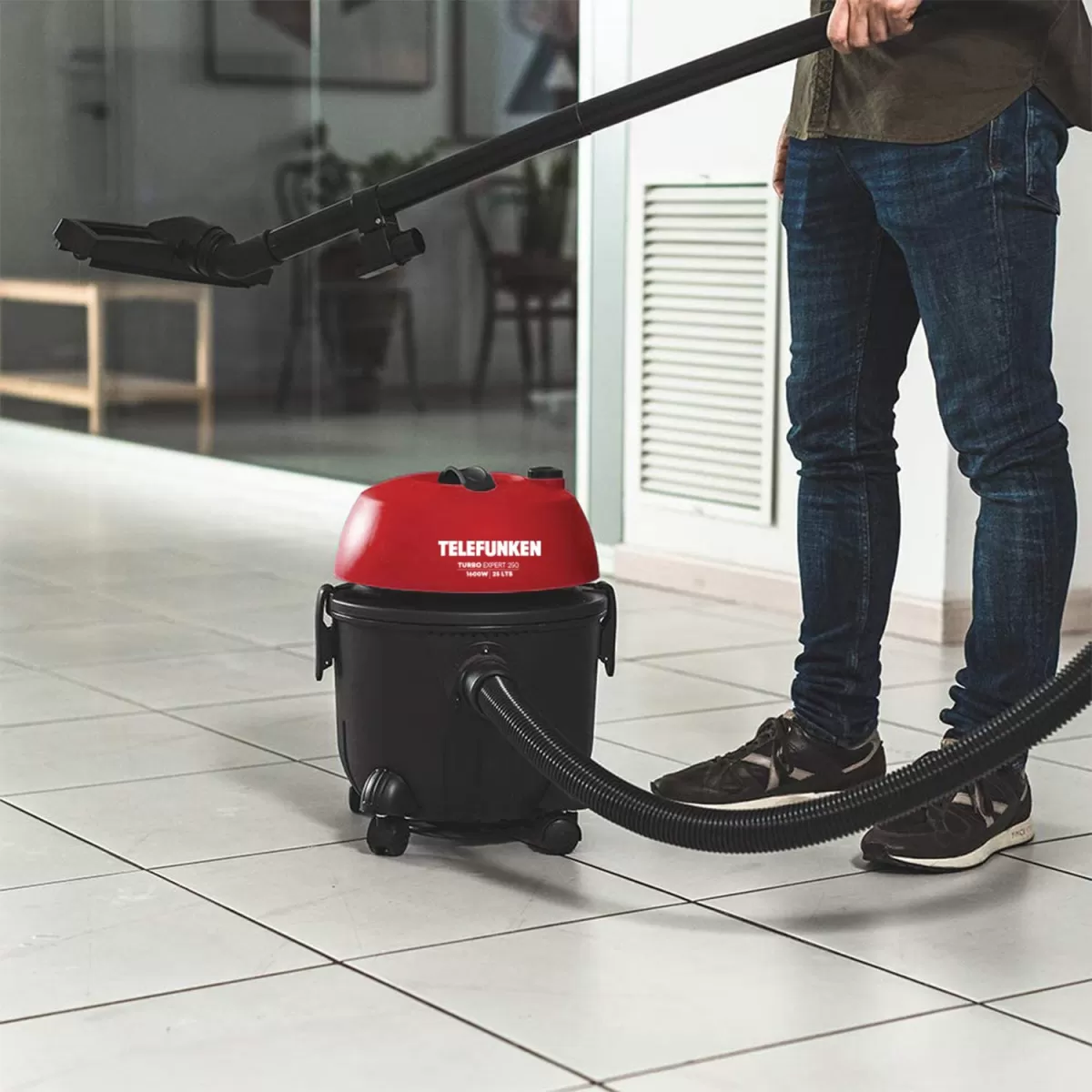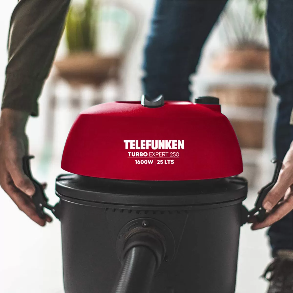 La aspiradora Telefunken Turbo Expert 250 es ideal para quienes buscan limpieza profunda, eficiencia y practicidad. Con 1600W de potencia y una capacidad de 25 litros, permite aspirar polvo y líquidos con gran facilidad gracias a su tecnología Wet & Dry. Su tambor de acero inoxidable es resistente y liviano, mientras que el filtro H.E.P.A. ayuda a eliminar el 99.9% de virus, bacterias y ácaros.