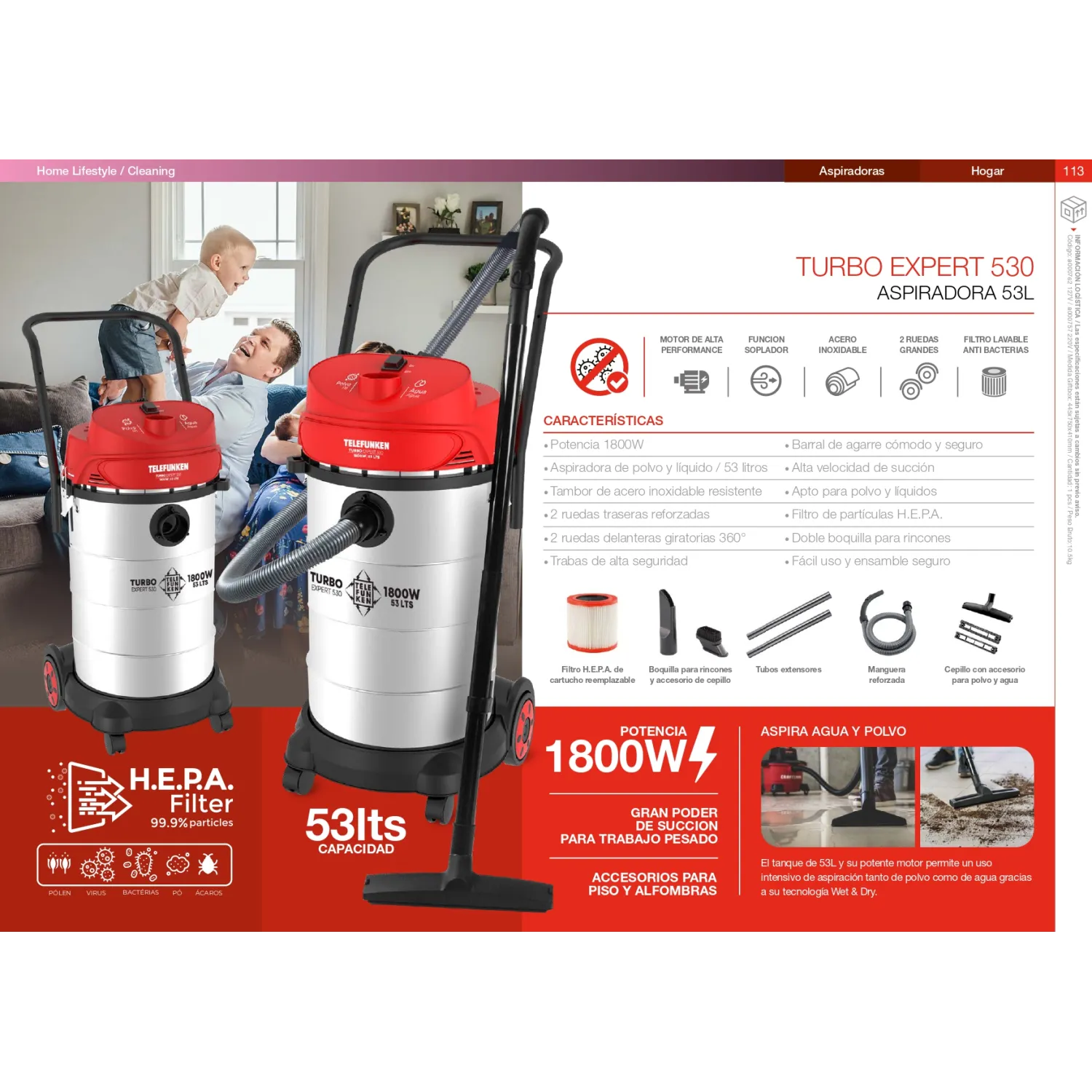 La Aspiradora Telefunken Turbo Expert 530 está diseñada para trabajo pesado, ofreciendo máxima potencia, gran capacidad y funciones avanzadas para limpiezas exigentes.