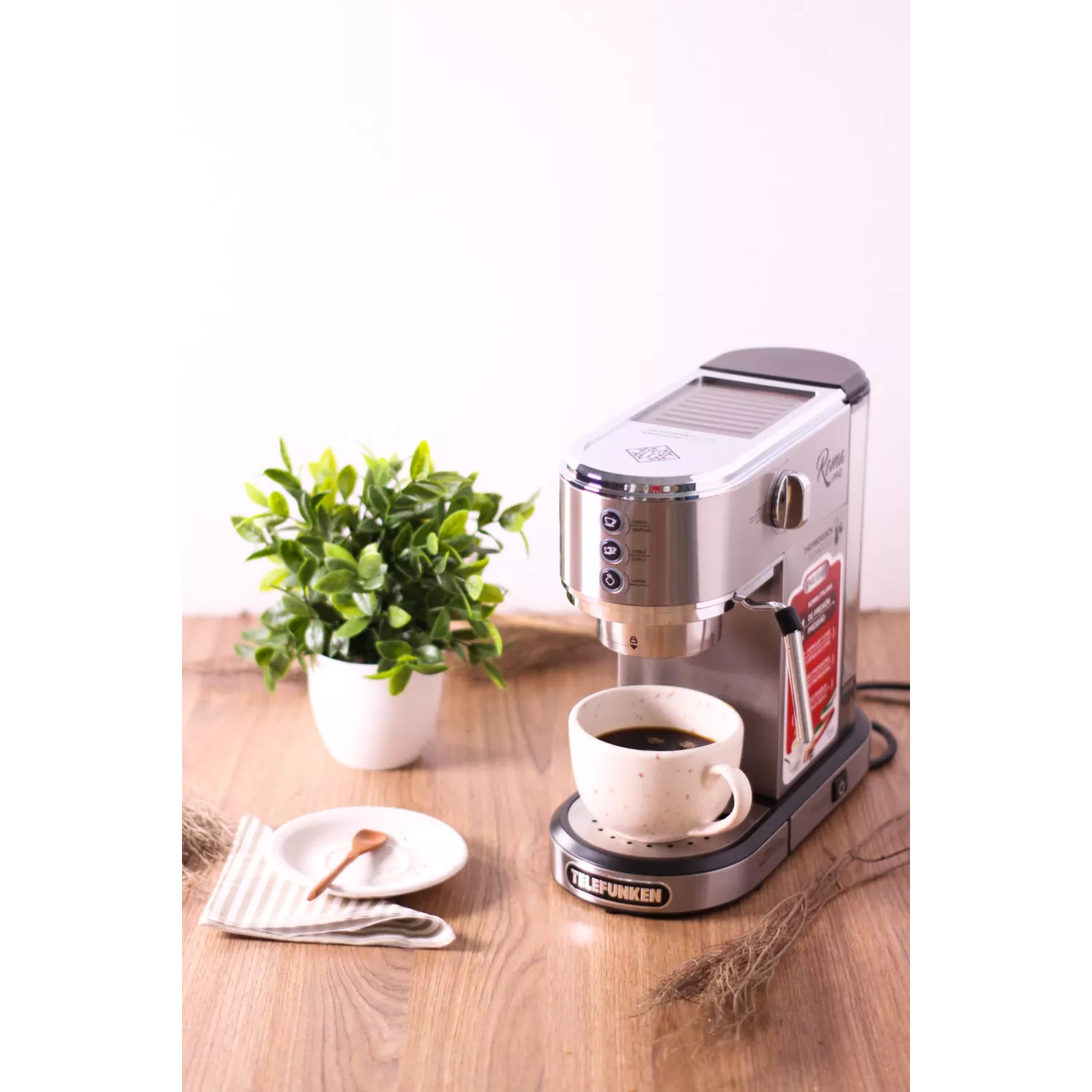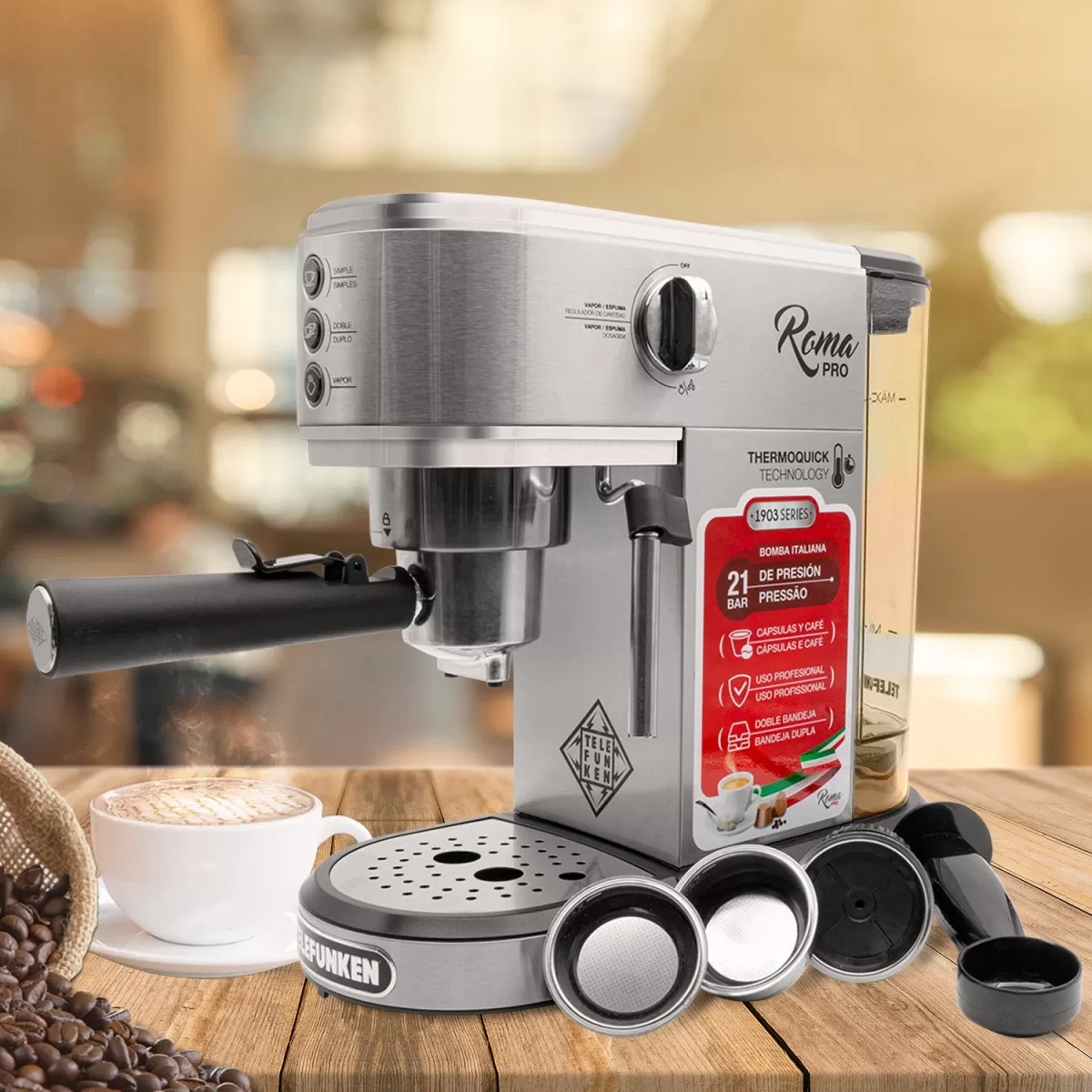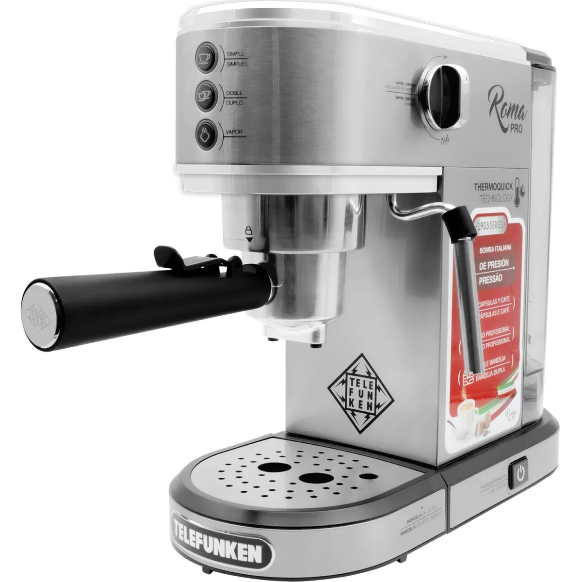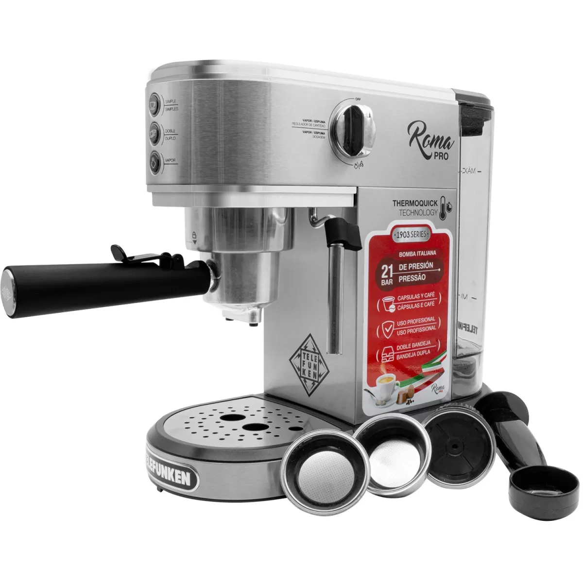 Viví la experiencia del auténtico espresso con la Cafetera Telefunken Roma Pro, una máquina compacta, elegante y potente, ideal para los amantes del buen café. Con diseño profesional y funcionalidad versátil, esta cafetera es compatible tanto con café molido como con cápsulas , adaptándose a tu rutina y gusto.