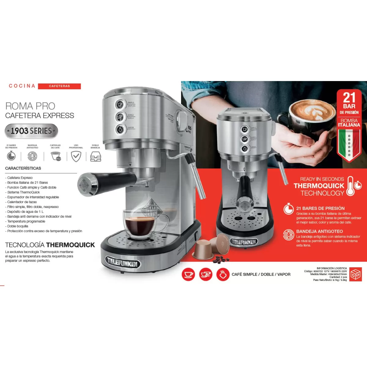 Cuenta con bomba Italiana con 21 Bares de presión para extraer todo el sabor, color y aroma del café, y la crema de cada taza, vaporizador para espumar leche y preparar cappuccinos o lattes, y un diseño robusto con terminaciones en acero inoxidable que se destaca en cualquier cocina.