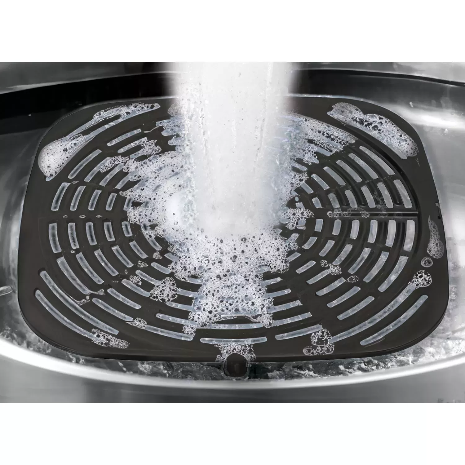 Incluye una pantalla digital táctil, 8 programas automáticos, control de temperatura y tiempo digital, y una práctica canasta extraíble con base desmontable, que facilita la limpieza. Además, el visor de vidrio transparente y su Luz interior permite seguir la cocción sin abrir la freidora, manteniendo la temperatura estable.