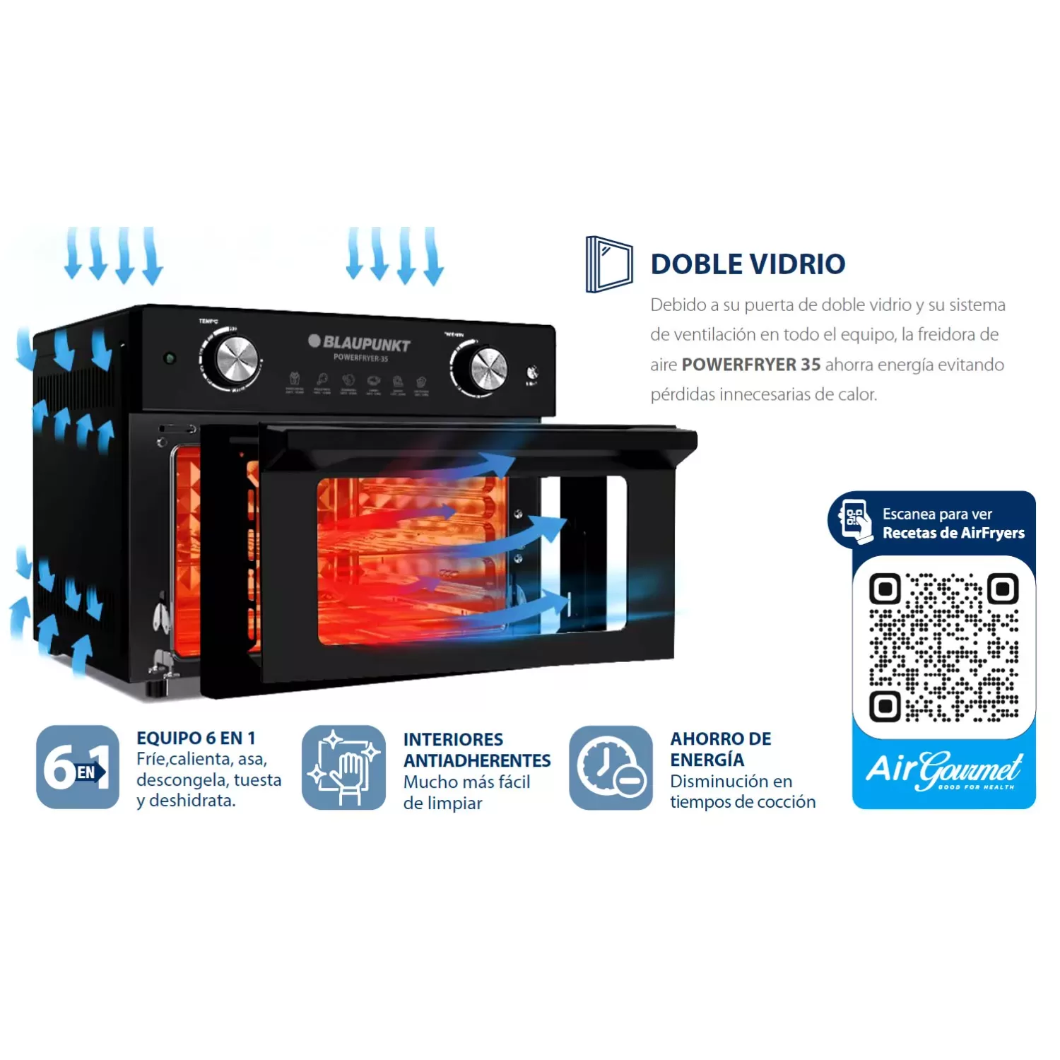 Freidora Sin Aceite por Aire Caliente tipo Horno BLAUPUNKT POWER FRYER 35, con Puerta de DOBLE VIDRIO TEMPLADO, brindando Mayor Eficiencia Energética por Minimizar la Pérdida de Calor y resultando mas Fría al Tacto. 35L de Capacidad y 1800W de Potencia. Múltiples posiciones de Cocción, 4 Bandejas accesorias y 6 Funciones: Freir, Calentar, Asar, Descongelar, Tostar y Deshidratar.