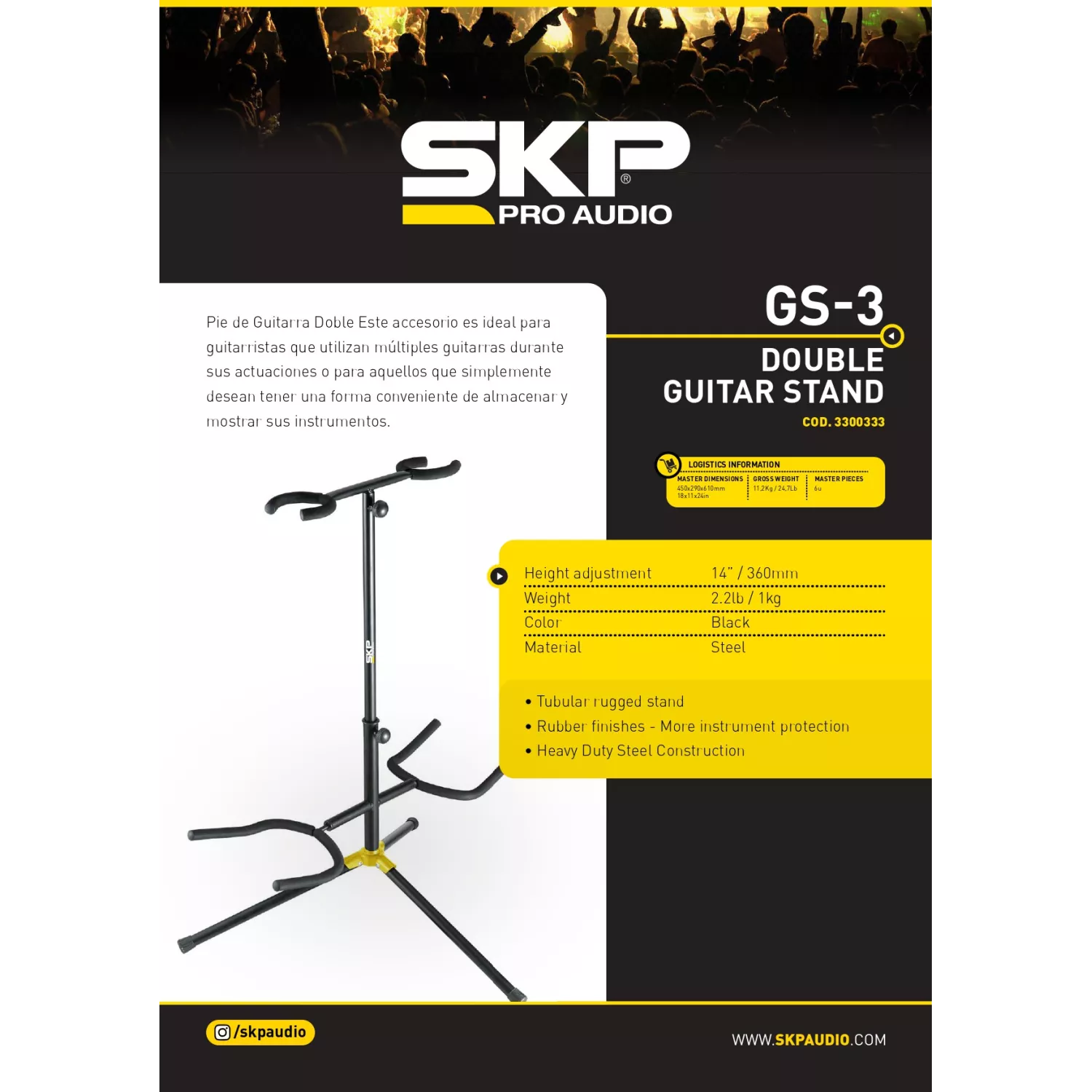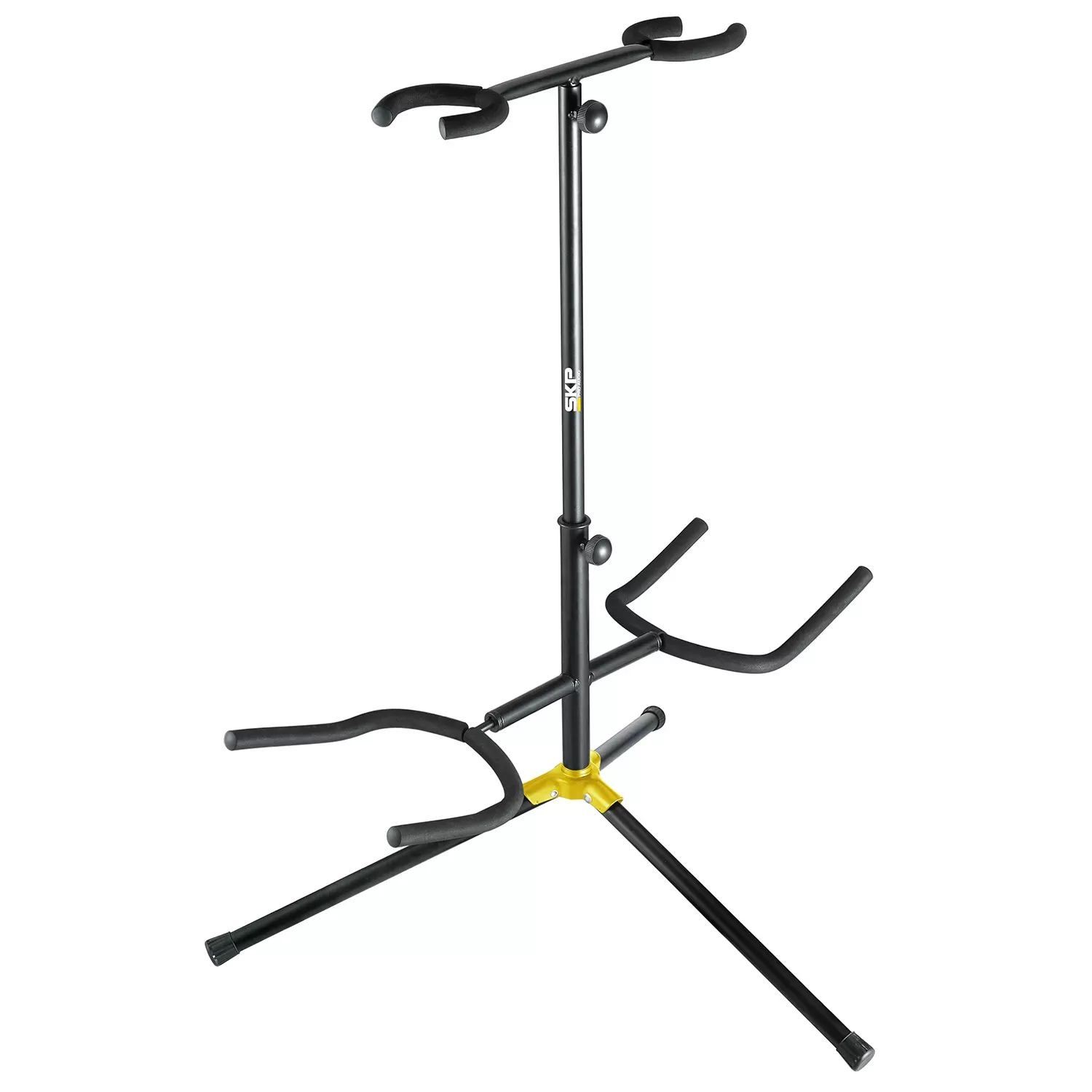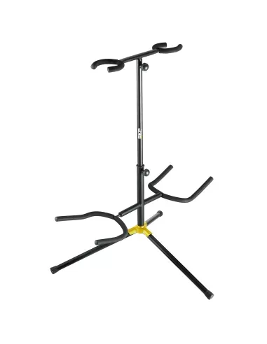 Pie de Guitarra Doble Este accesorio es ideal para guitarristas que utilizan múltiples guitarras durante sus actuaciones o para aquellos que simplemente desean tener una forma conveniente de almacenar y mostrar sus instrumentos.