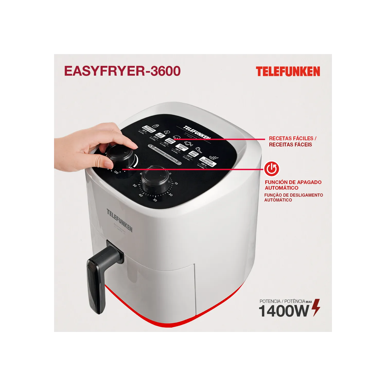 La Telefunken EasyFryer-3600 es tu aliada perfecta para cocinar de forma práctica, saludable y sabrosa todos los días. Su diseño compacto y moderno forma parte de la línea Life Series, ideal para cocinas funcionales y dinámicas.