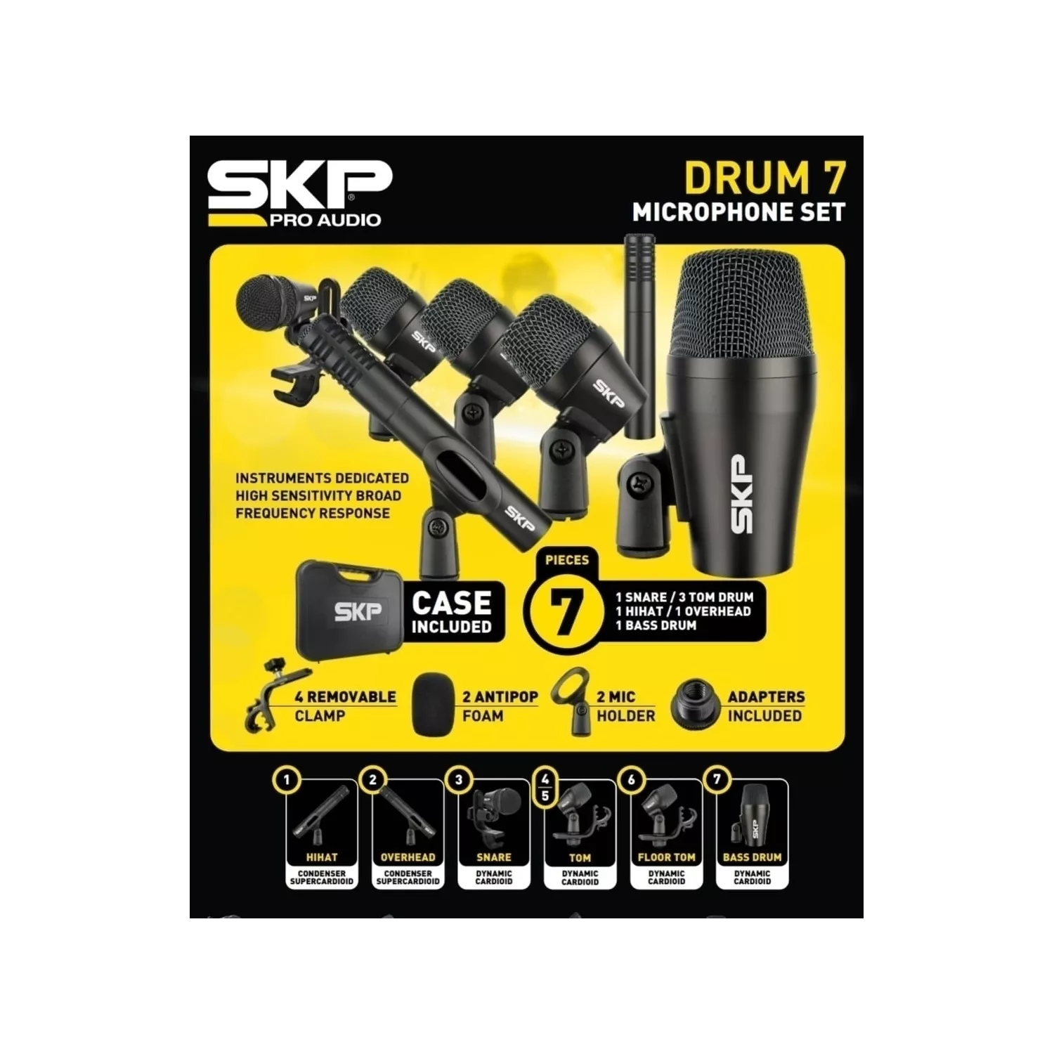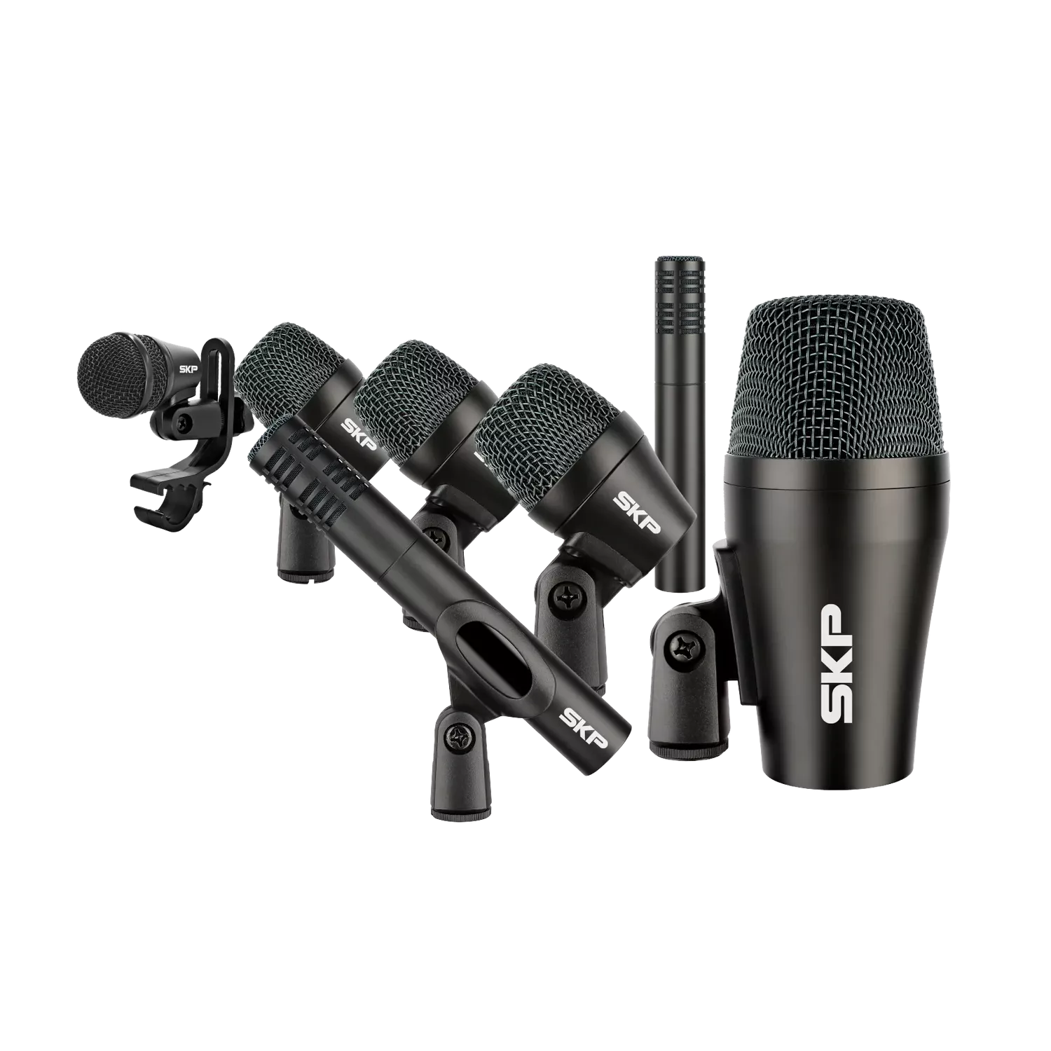 El DRUM 7 es un kit profesional de micrófonos diseñado para capturar con precisión todos los sonidos de una batería de 5 piezas. Incluye micrófonos dinámicos cardioides para el bombo, redoblante y toms, además de micrófonos condenser overhead para platillos. Su diseño compacto y clips integrados permiten una fácil colocación sin obstruir el movimiento del baterista. Conectados a través de cables XLR (F), ofrecen una señal de alta calidad ideal para grabaciones y presentaciones en vivo.