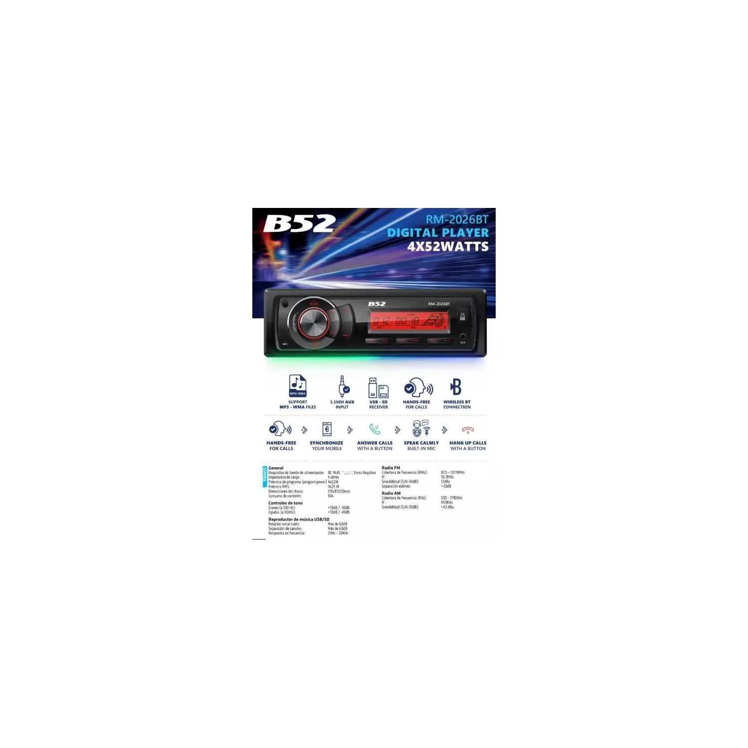 Viví una experiencia de audio superior en tu auto con el Stereo B52 RM-2026BT, un reproductor digital completo que combina potencia, conectividad y funcionalidad. Con salida de 4x52 watts, este equipo ofrece un sonido nítido y potente para disfrutar tu música favorita al máximo.