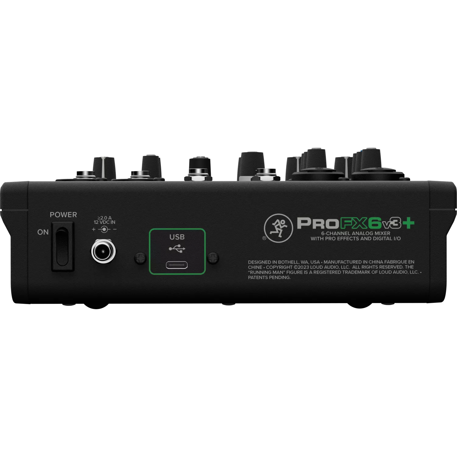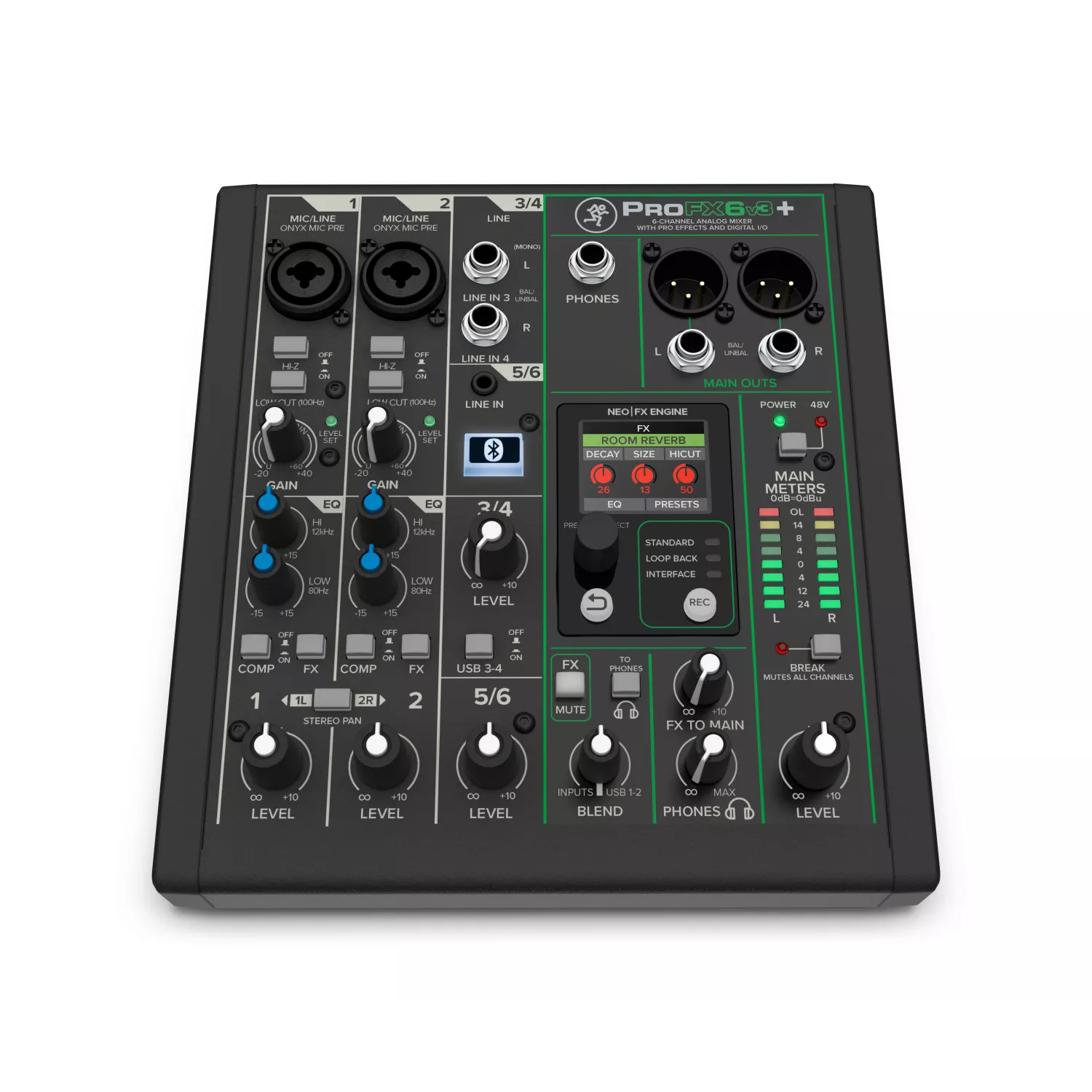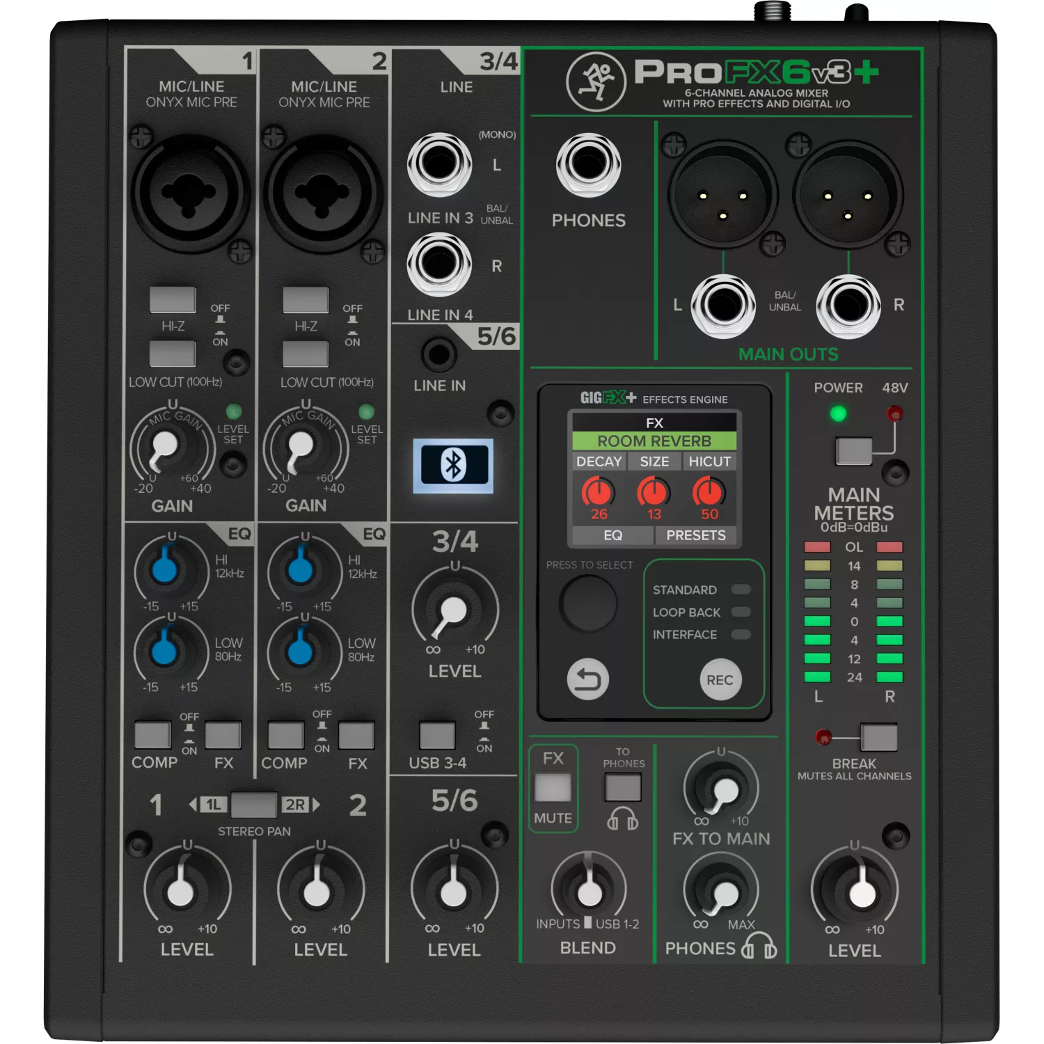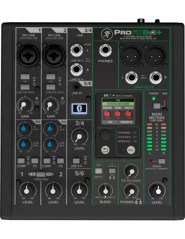 Mackie ProFX6v3+ es un mezclador analógico profesional e interfaz de audio USB-C con potentes mejoras para grabaciones y transmisiones en vivo con calidad de estudio. Captura tu interpretación con los preamplificadores y el ecualizador de canal Onyx, añade audio de computadora mediante loopback, realiza llamadas por Bluetooth® y mejora tu sonido con los efectos GigFX+ mejorados en una pantalla LCD a color.