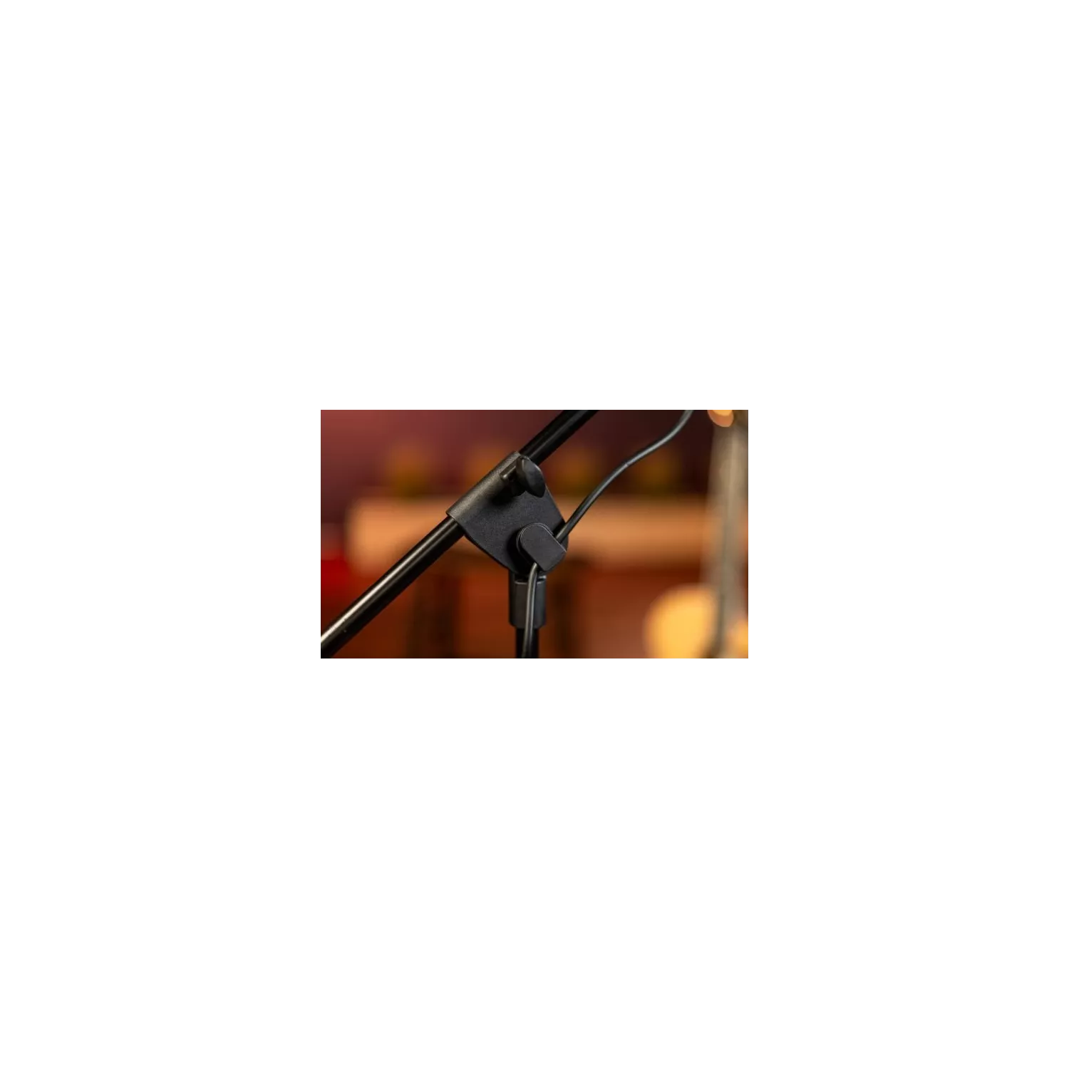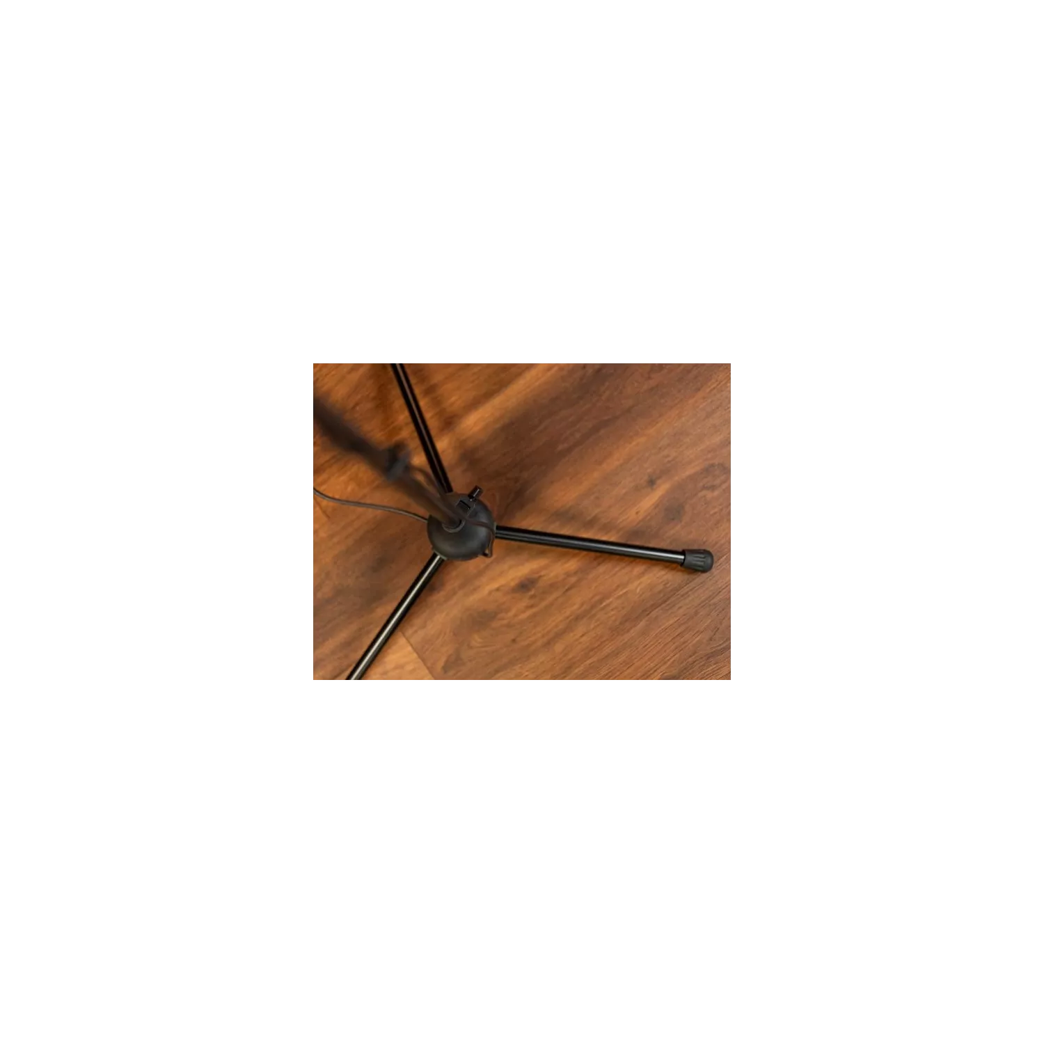 - Soporte de micrófono con trípode y brazo articulado con acabado en pintura en polvo negra
