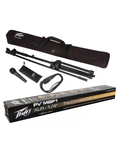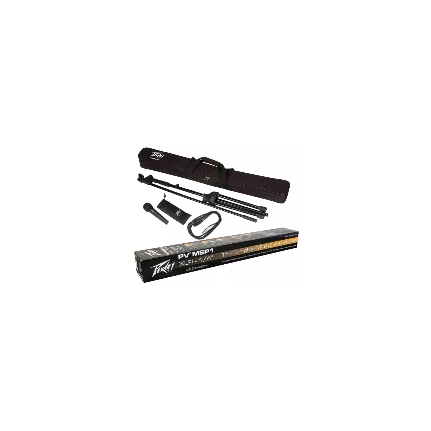 El PV® MSP1 incluye el micrófono cardioide dinámico PV®i 100 de Peavey, listo para el rendimiento, que se puede apagar cuando no se usa, así como un soporte de jirafa tipo trípode totalmente ajustable, ideal para voces, guitarras acústicas, amplificadores, baterías y cualquier otro instrumento.
