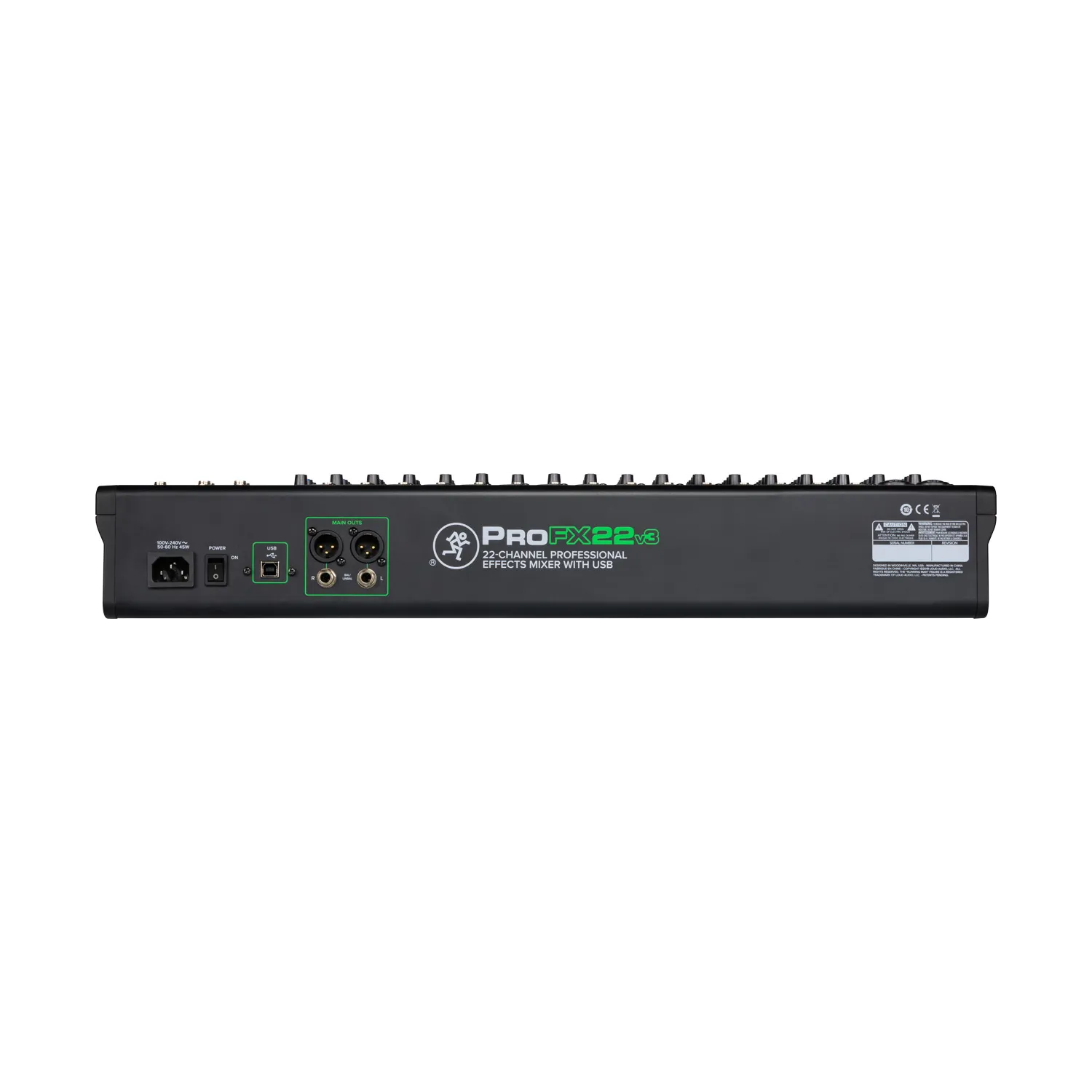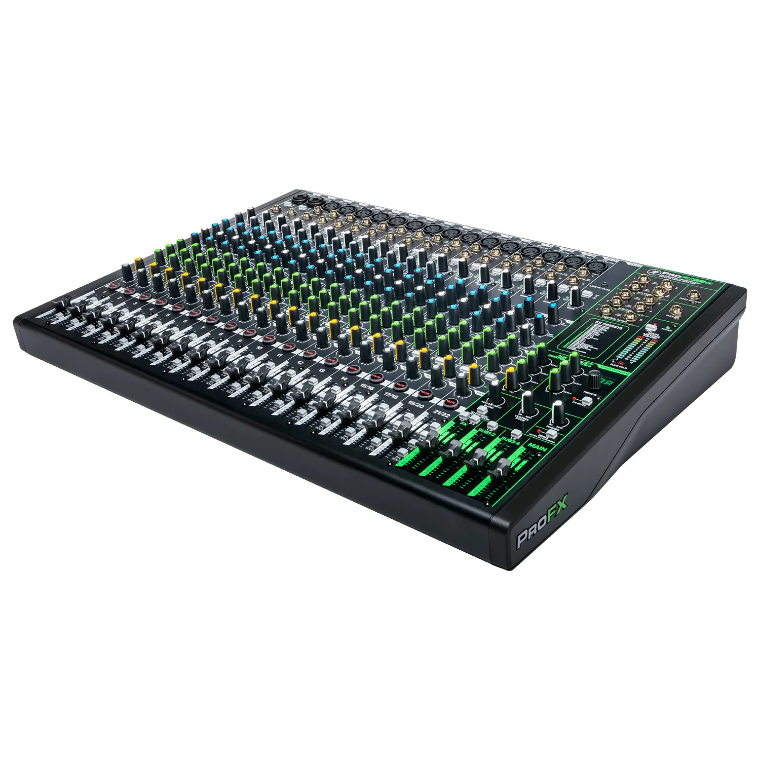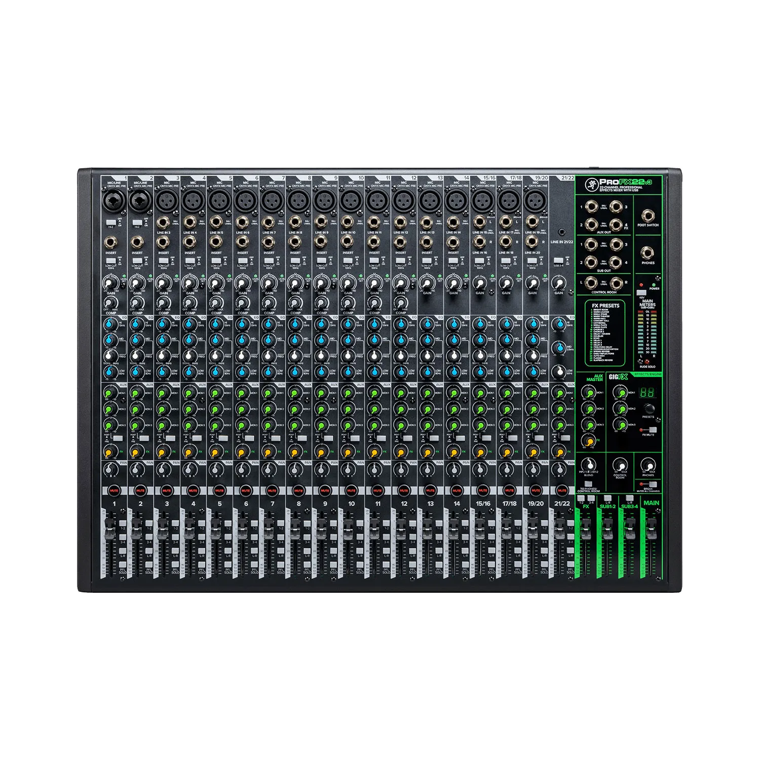 La Mackie ProFX22v3 cuenta con diecisiete preamplificadores de micro Onyx premium para capturar audio prístino en el estudio o en el escenario. Un nivel de ruido ultrabajo y hasta 60 dB de ganancia se traducen en toneladas de headroom y claridad para cualquier micrófono.