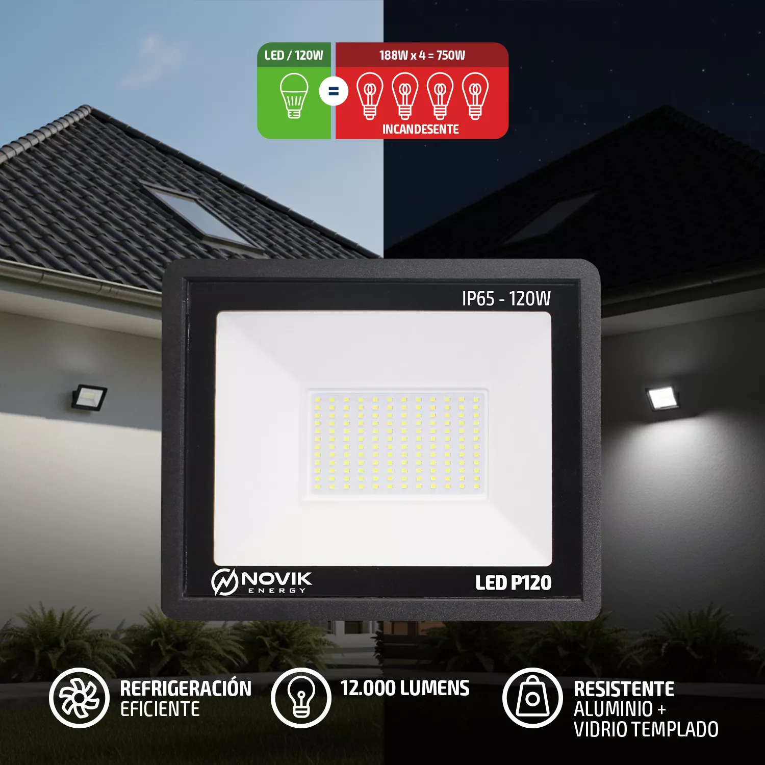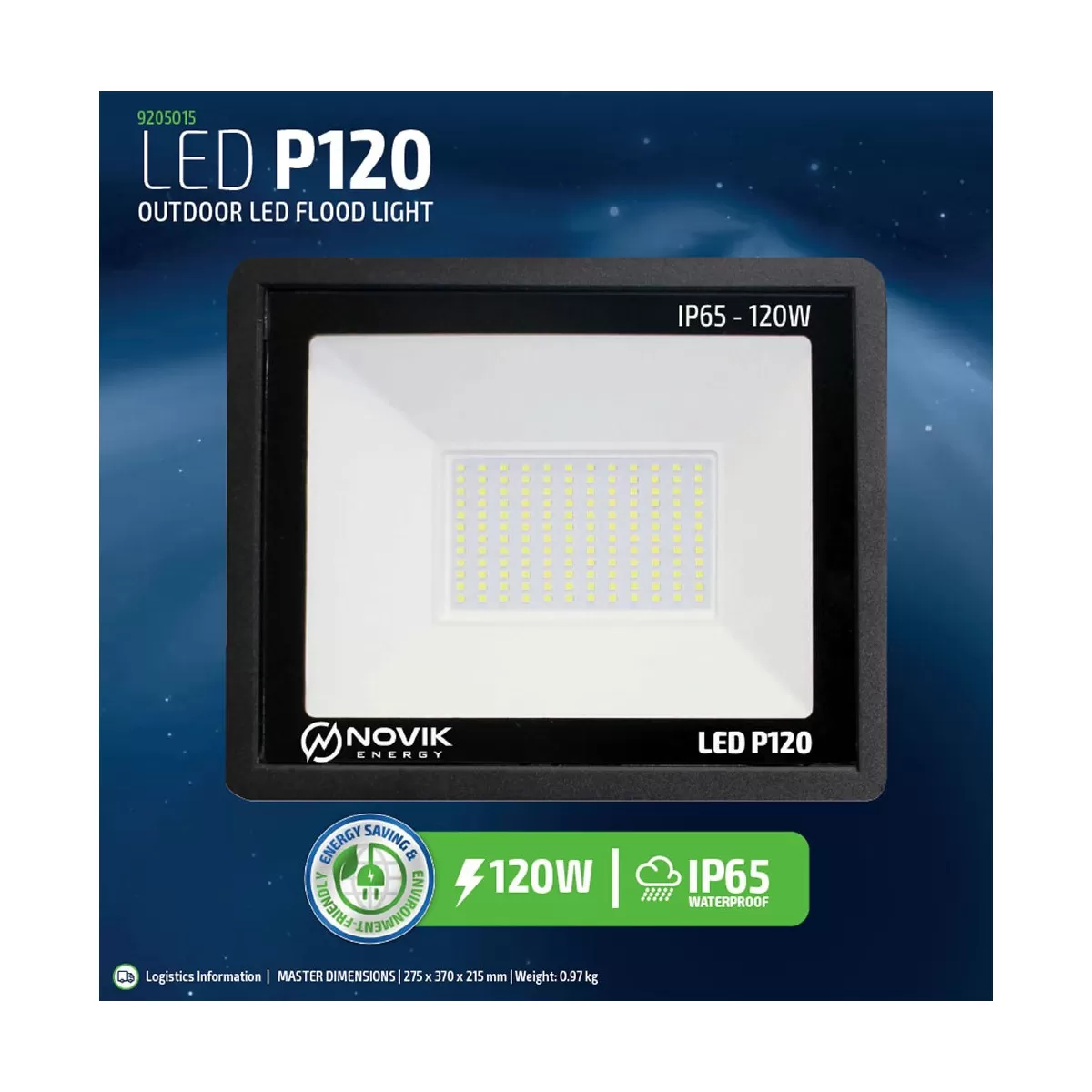 Reflector Proyector NOVIK Energy LED P120 para Exterior. Potencia 120W. Carcasa de Aluminio y Resistente al Agua con Certificación IP65. Flujo Lumínico de 12.000 lumens irradiados por 144 Leds