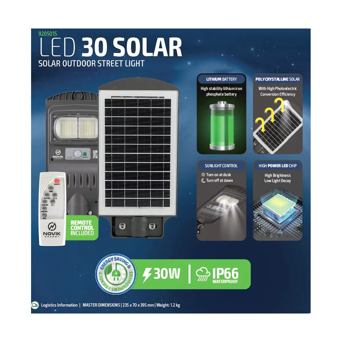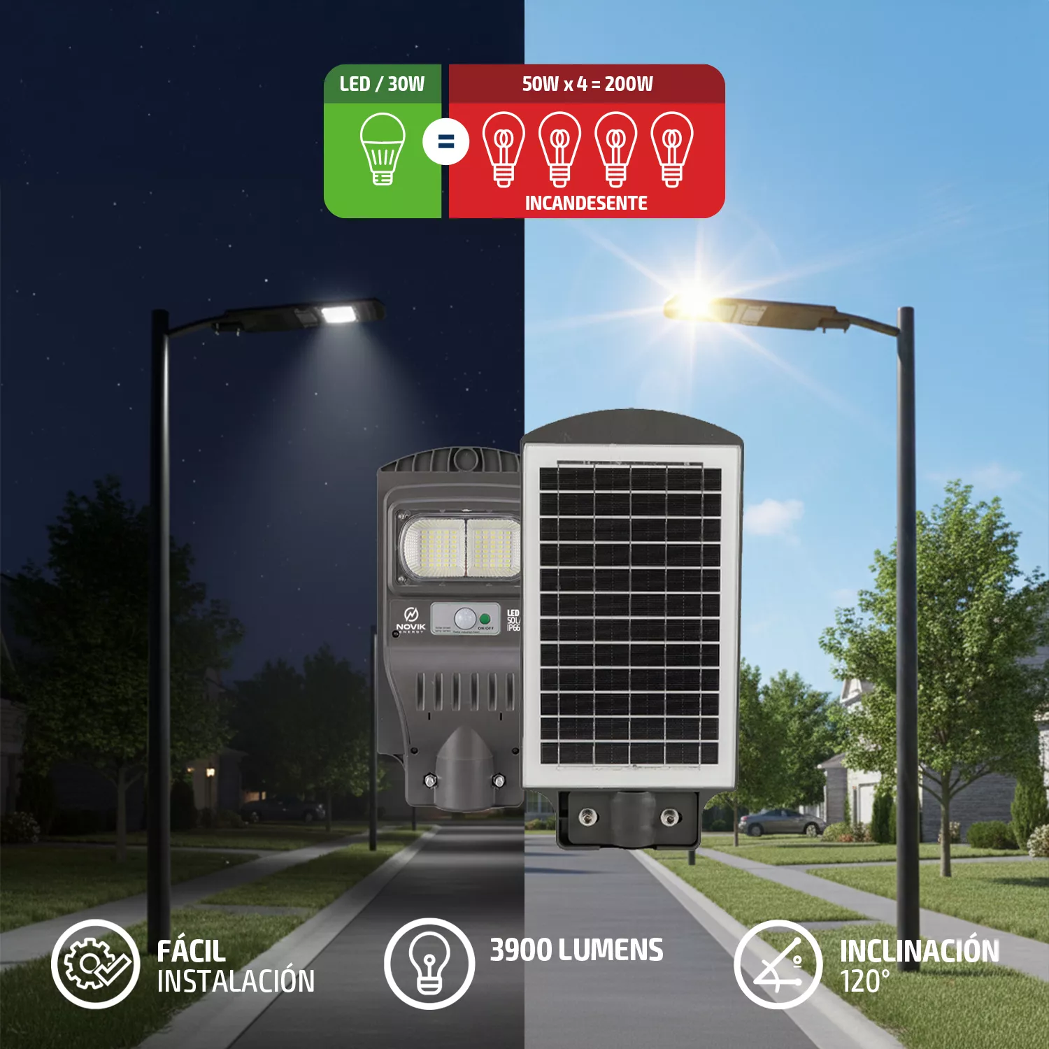 El Reflector NOVIK LED SOLAR 30, de sólo 30W de consumo, integrado por 80 Leds, utiliza la electricidad que genera el Panel de Celdas Solares, para irradiar una potente Luz de 3900 lumens. La ventaja del producto es que no hay cables, fácil de instalar y es Apto para Exteriores con Certificación IP66 de Resistencia al Agua.
