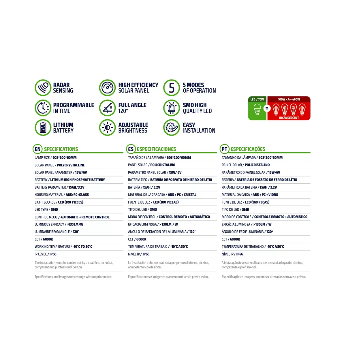 La lámpara eléctrica bajo consumo, formada por Leds, utiliza la electricidad que genera el Panel de Celdas Solares, para irradiar un potente Luz. La ventaja del producto es que no hay cables, fácil de instalar y sin electricidad. Durante el día, el panel solar absorbe la luz del sol, se convierte en electricidad y se almacena en baterías, para luego poder abastecer por la noche a la Luminaria que se encenderá automáticamente.