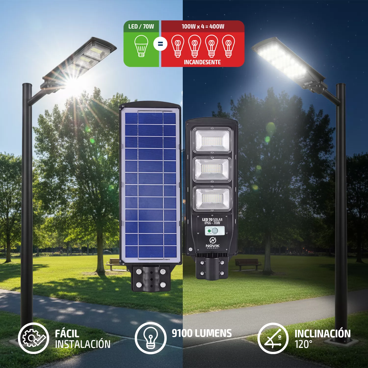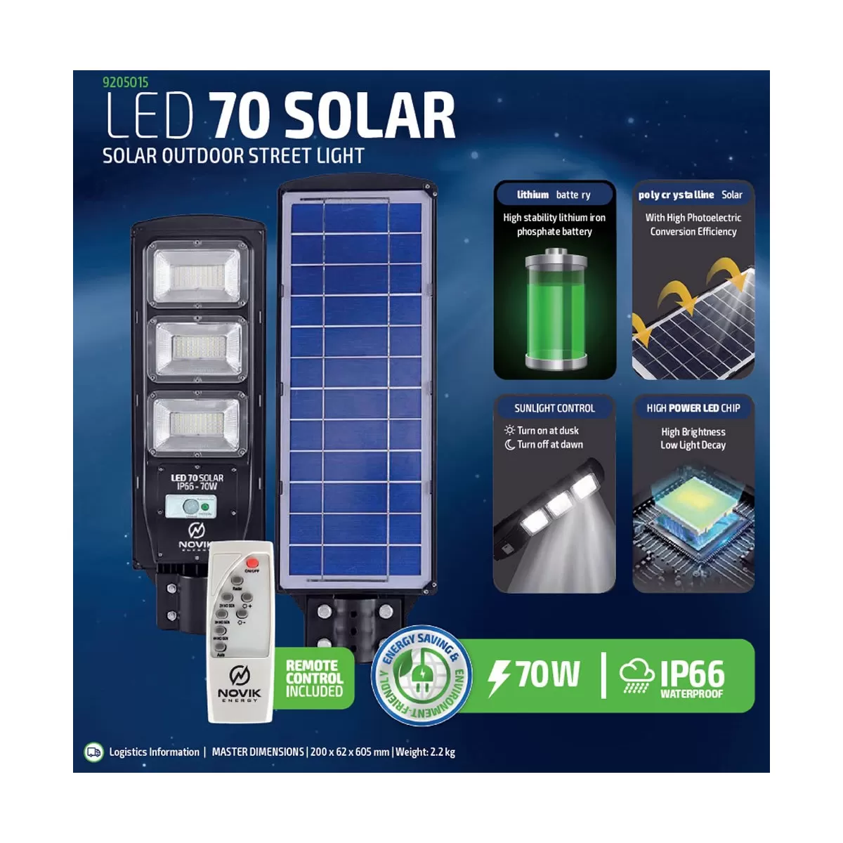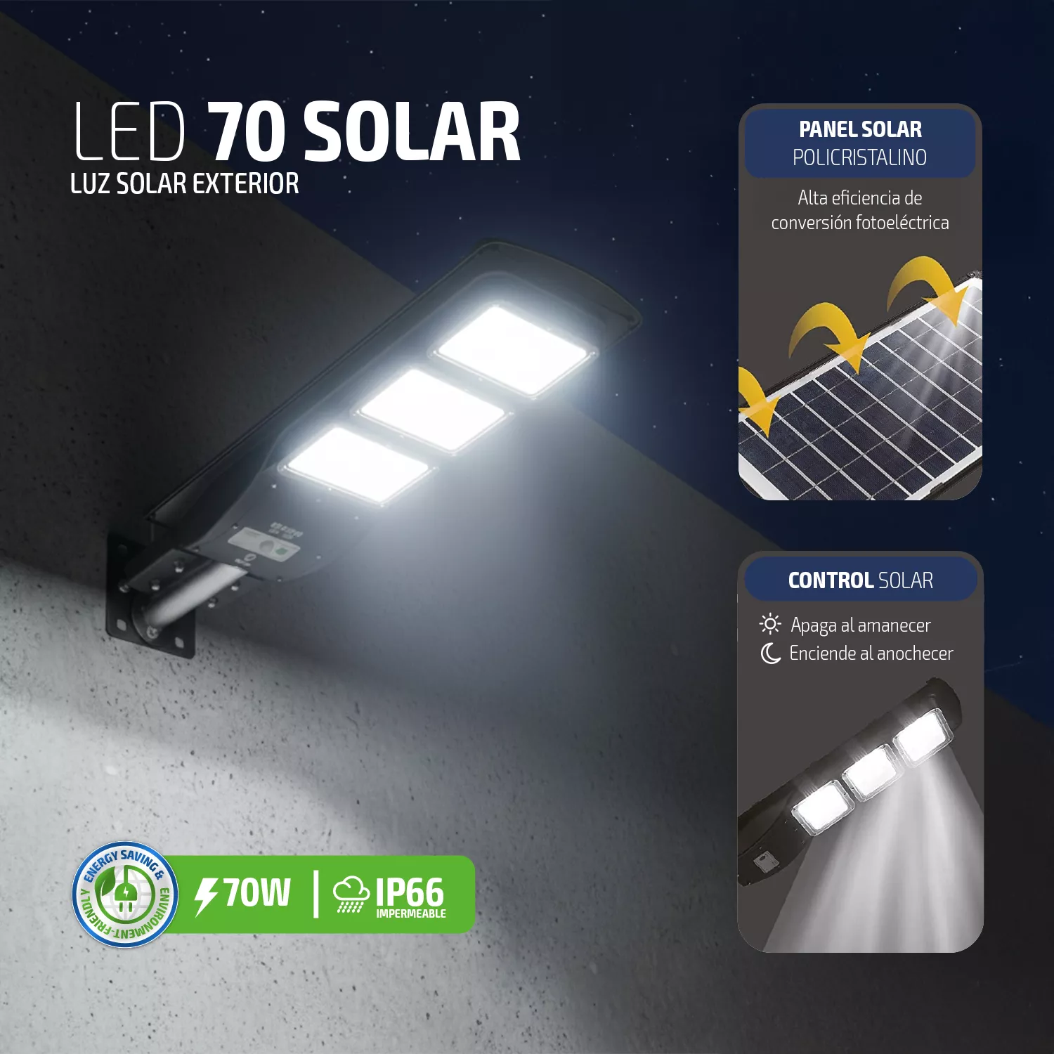 El Reflector NOVIK LED SOLAR 70 es un foco de exterior con panel solar incluido que convierte la energía de la luz solar en electricidad iluminando los lugares que más necesites. La ventaja de este producto es que no requiere de cableado, estructura liviana y fácil de instalar. Durante el día el panel solar absorbe la luz solar almacenándola en la batería y por la noche se encenderá automáticamente.