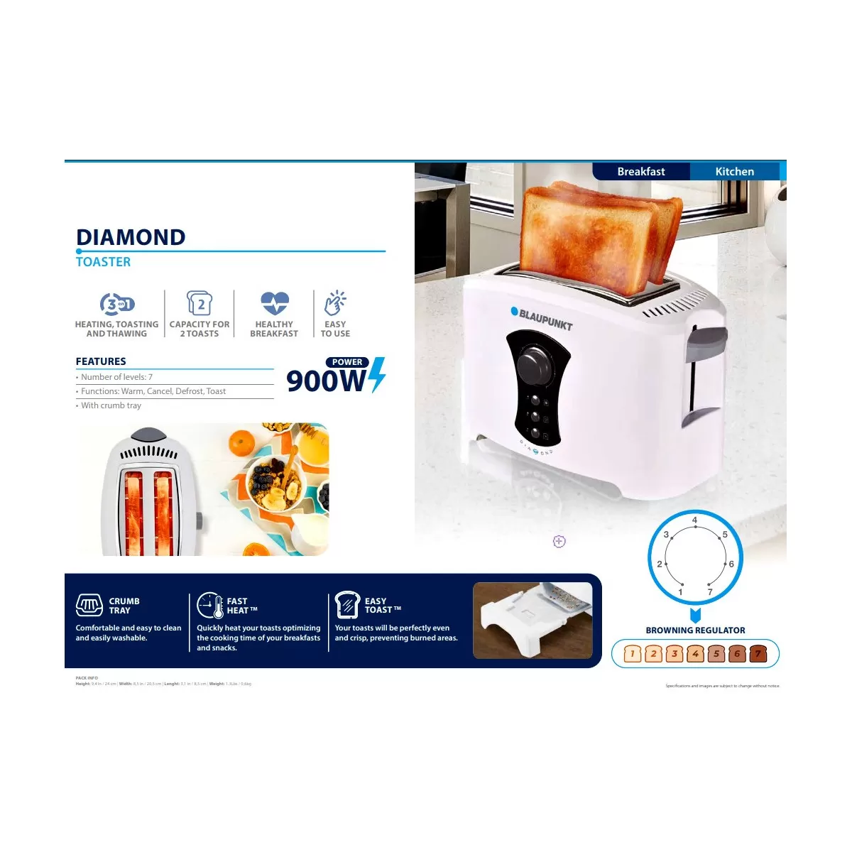 Convertí tus desayunos en un momento especial con la Tostadora Diamond, diseñada para ofrecer el tostado perfecto en cada rebanada. Su capacidad para 2 tostadas y sus 7 niveles de tostado te permiten elegir el punto exacto de dorado, desde ligeramente crujiente hasta bien tostado.