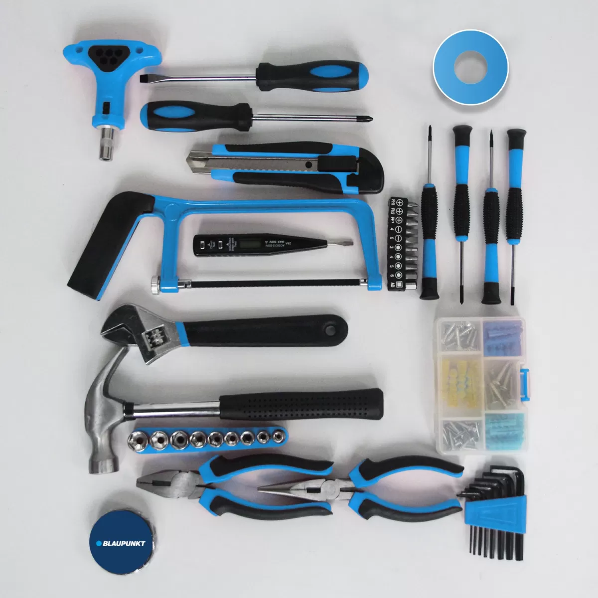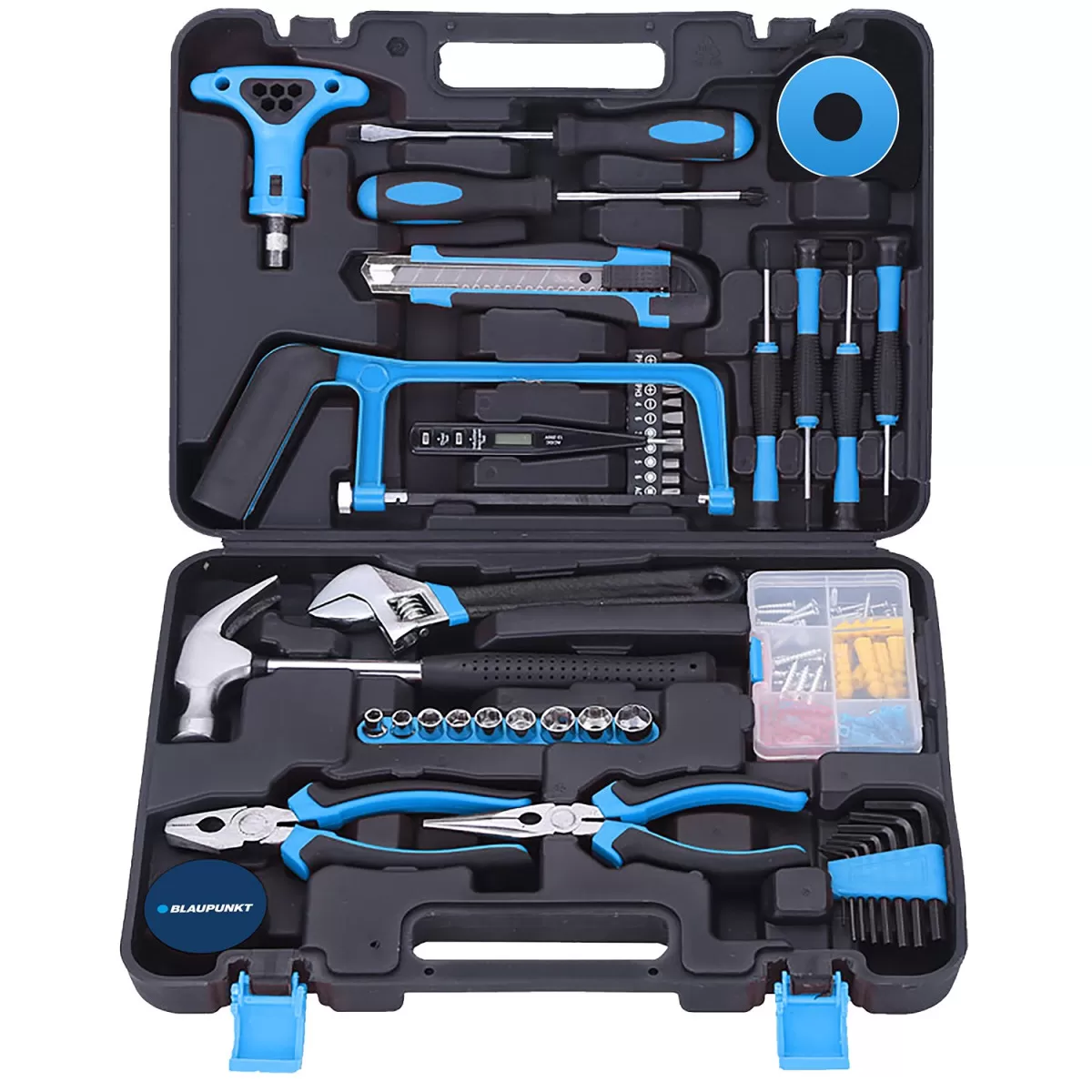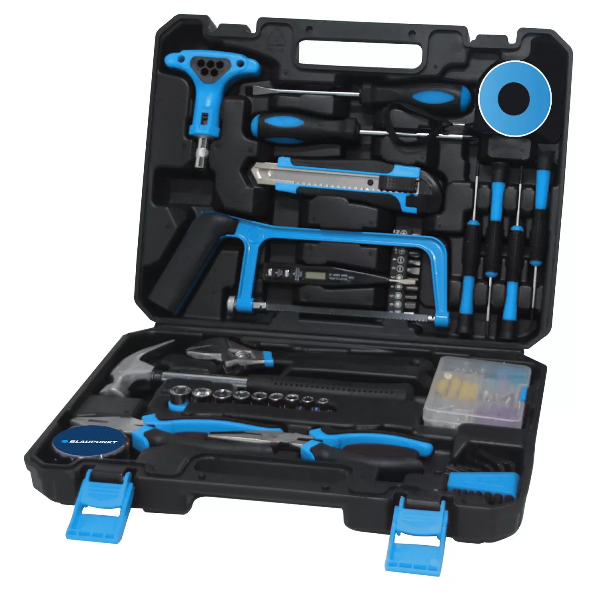El POWERKIT 400 de Blaupunkt es un kit de herramientas completo con 134 piezas, ideal para trabajos de mantenimiento, bricolaje, electricidad, carpintería y reparaciones en general. Incluye martillo, alicates, llaves Allen, cinta métrica, destornilladores, serrucho, cortante, linterna, tester de voltaje y más, todo organizado en un maletín rígido compacto y práctico.