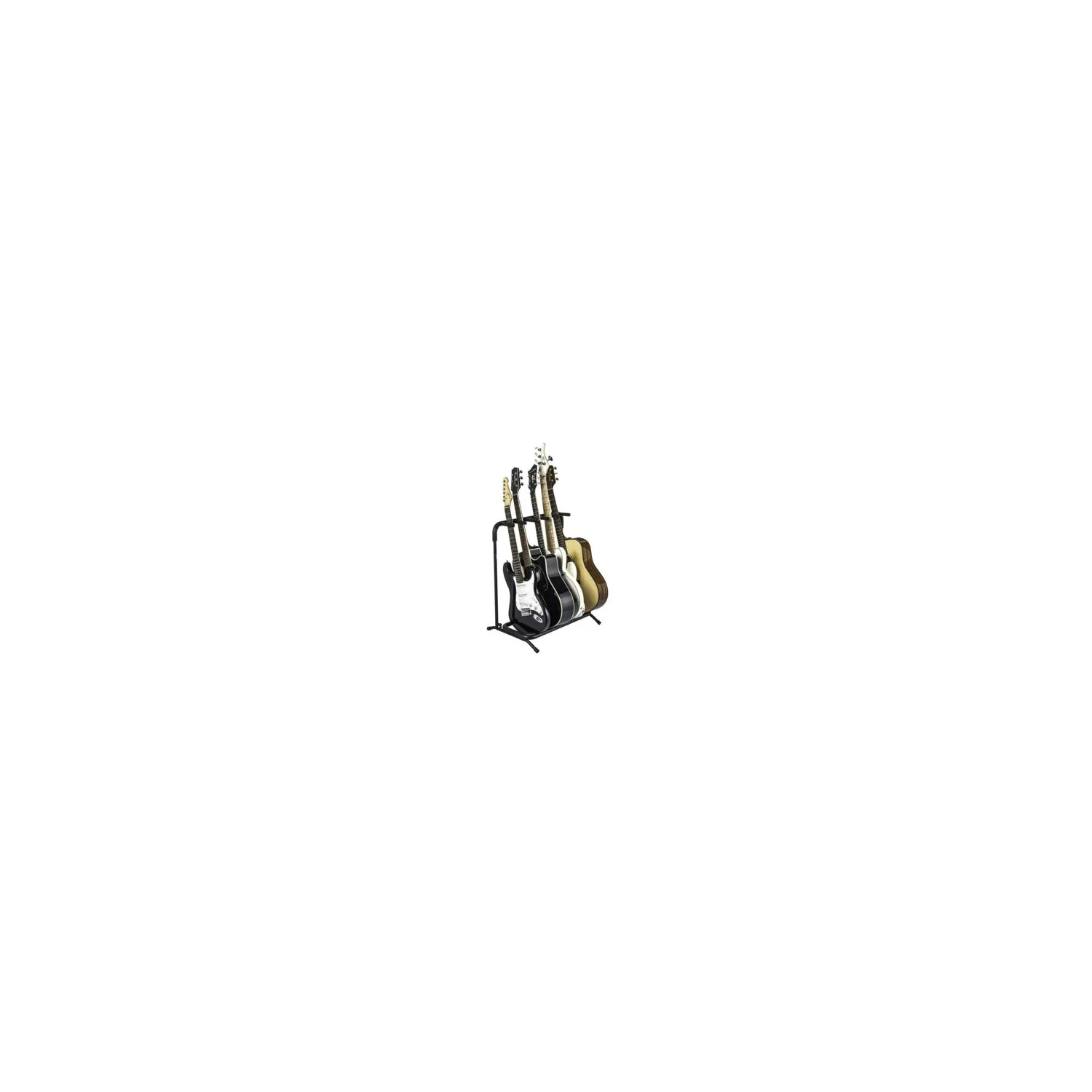 - Soporte universal de guitarra plegable hecho de acero. Indicado para acomodar cinco guitarras (clásicas / acústicas / eléctricas) y bajos. Las superficies de contacto están hechas de un material de espuma suave que asegura la protección de los instrumentos.
