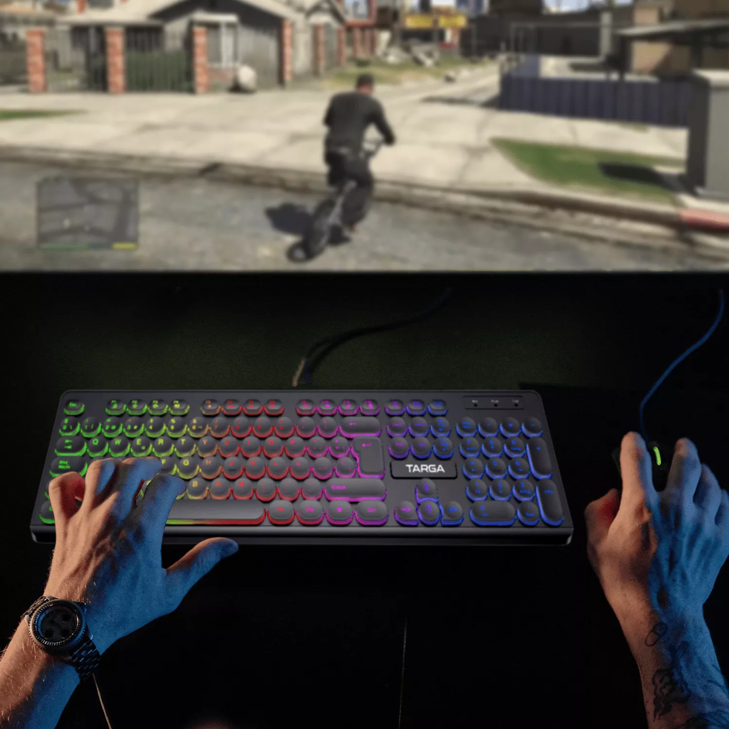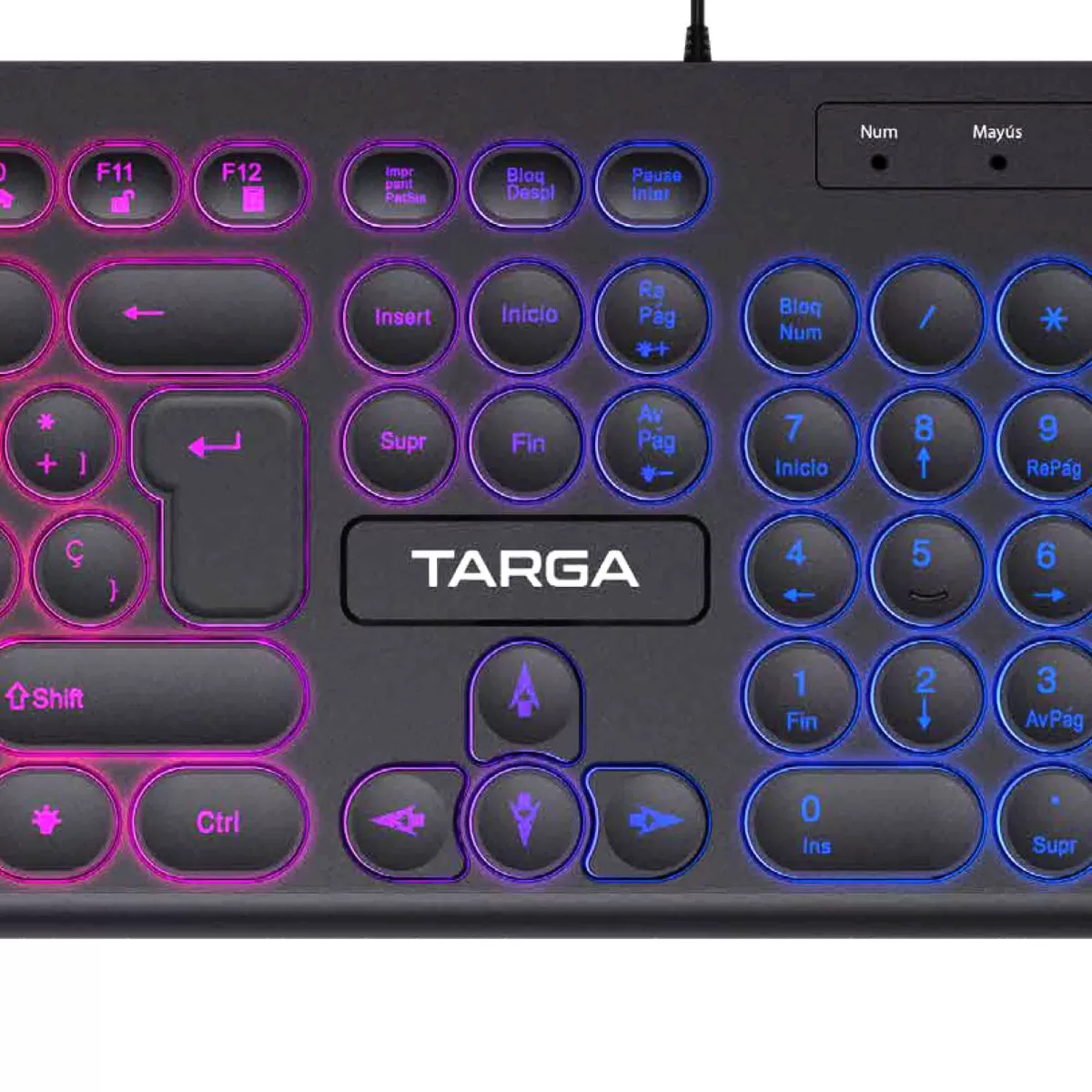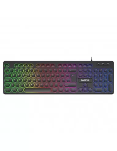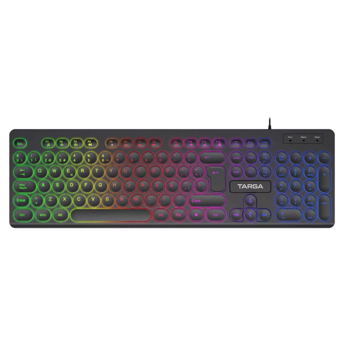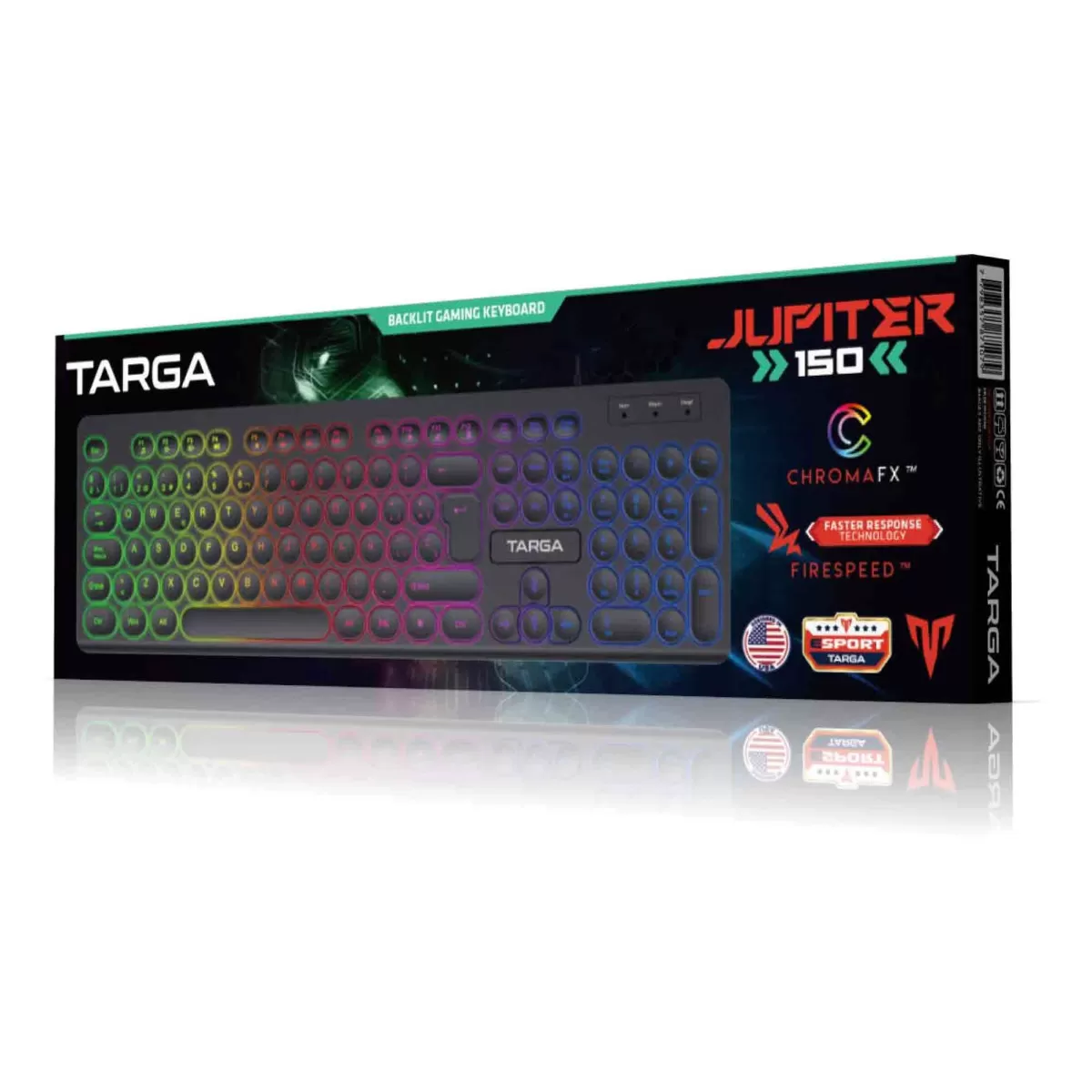 Teclado gamer targa jupiter 150 retroiluminado. Ultra delgado con ajuste total de brillo y programación full de luces rgb. Interfase usb. diseño ergonómico y full anti-ghosting. 12 teclas multimedia. Almohadillas antideslizantes. Teclas con terminación redonda, de altura y diseño ergonómico perfecto para mejor rendimiento. cable usb fuerte y largo para instalaciones profesionales.